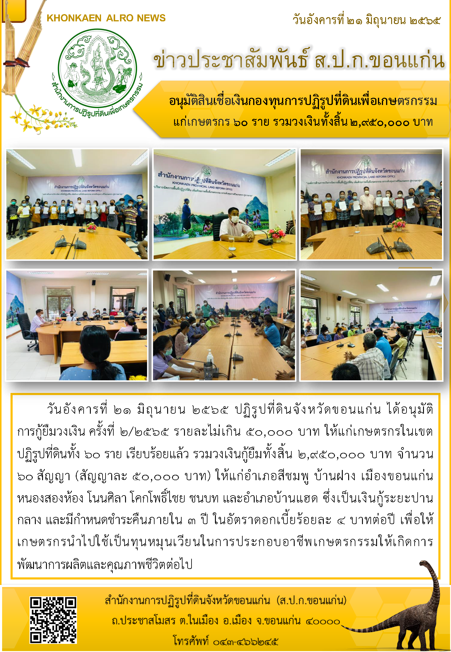 ส.ป.ก.ขอนแก่น อนุมัติสินเชื่อเงินกองทุนการปฏิรูปที่ดินเพื่อเกษตรกรรมแก่เกษตรกร 60 ราย รวมวงเงินทั้งสิ้น 2,950,000 บาท