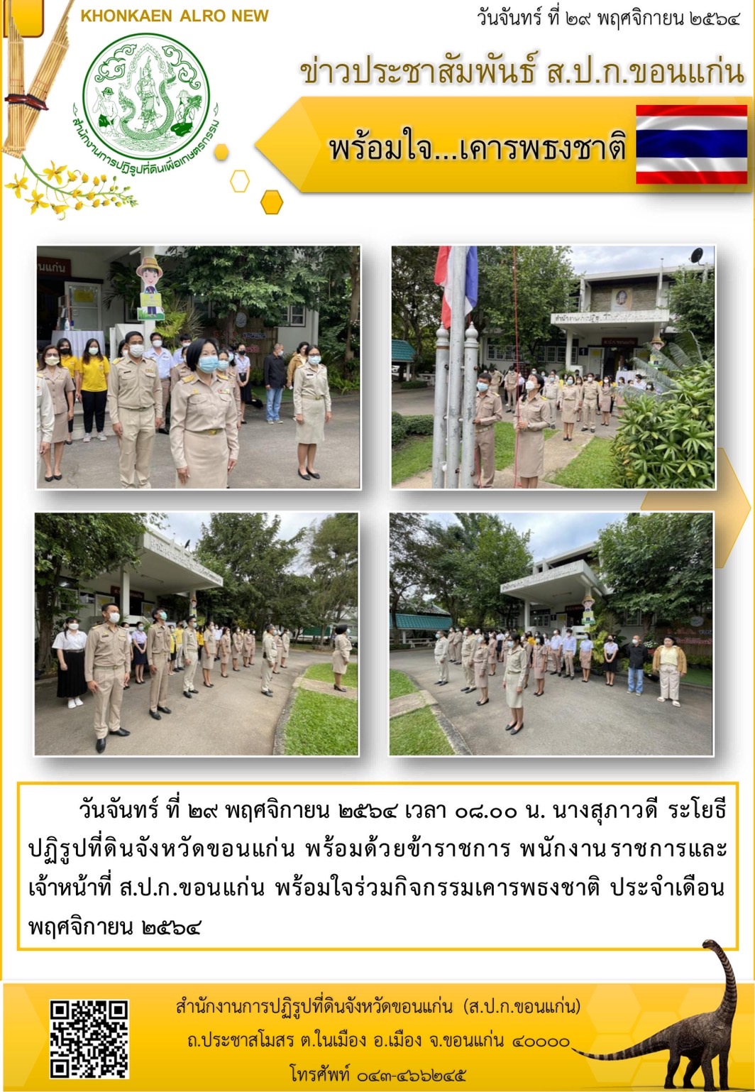 ส.ป.ก.ขอนแก่น ทำกิจกรรมเคารพธงชาติ ณ ลานเสาธง หน้าอาคาร 1 สำนักงานการปฏิรูปที่ดินจังหวัดขอนแก่น ประจำเดือนพฤศจิกายน ปี 2564