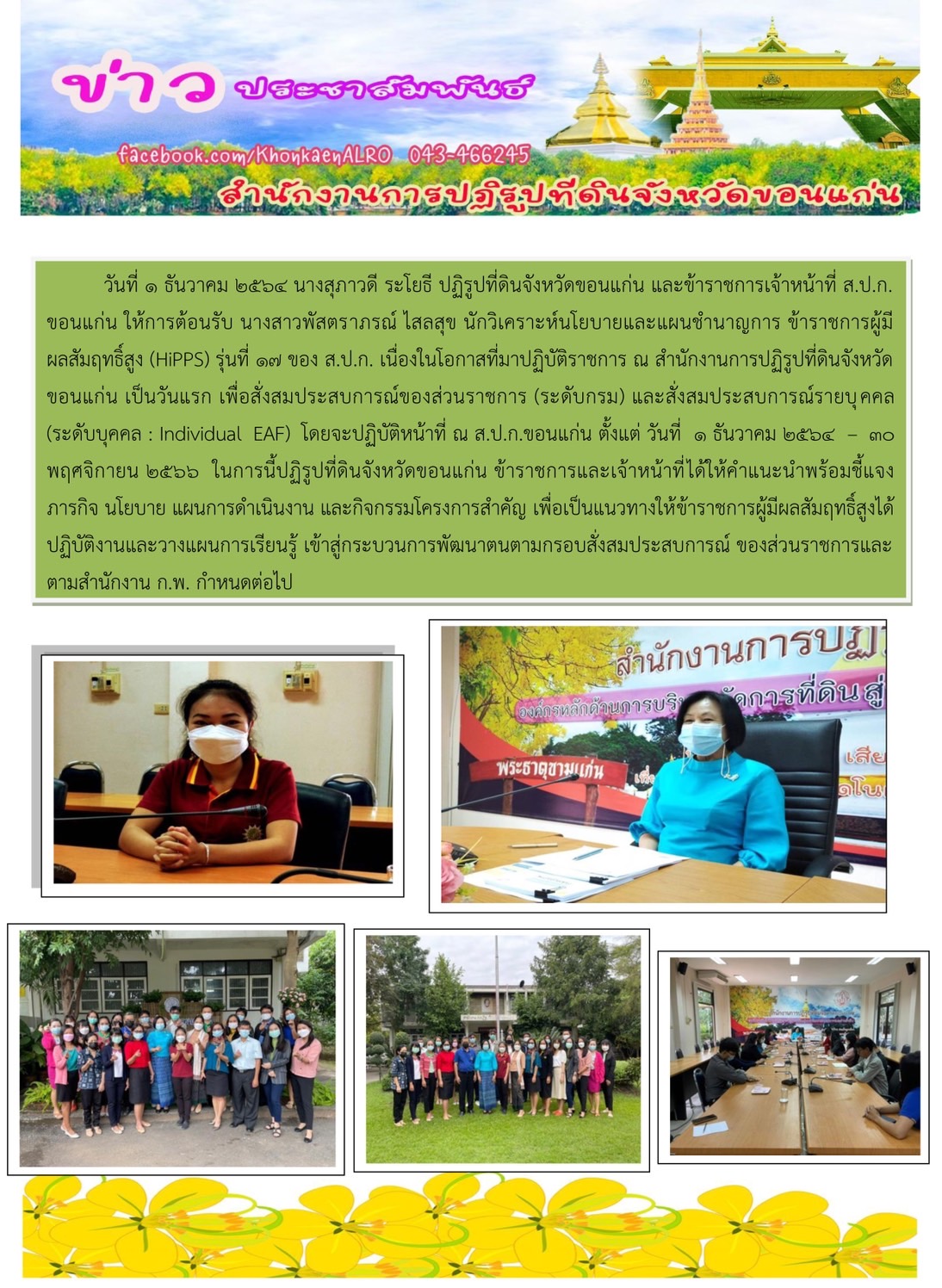 ส.ป.ก.ขอนแก่น ให้การต้อนรับ นางสาวพัสตราภรณ์ ไสลสุข นักวิเคราะห์นโยบายและแผนชำนาญการ ข้าราชการผู้มีผลสัมฤทธิ์สูง (HIPPS) รุ่นที่ 17 ของ ส.ป.ก.