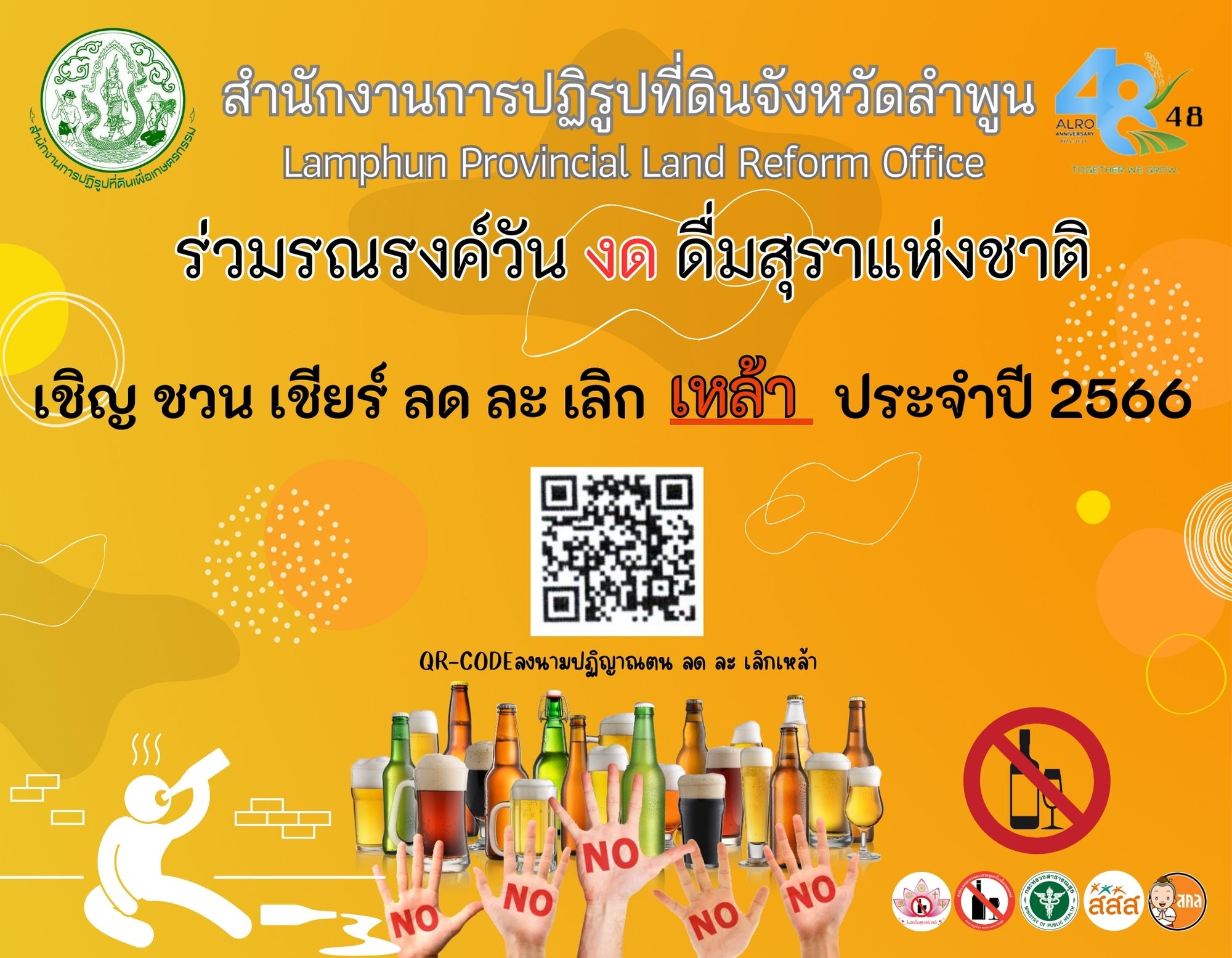 สำนักงานการปฏิรูปที่ดินจังหวัดลำพูน เชิญชวนให้ ข้าราชการ พนักงานราชการ เจ้าหน้าที่ในสังกัด และประชาชนร่วมกันรณรงค์ เชิญ ชวน เชียร์ ลด ละ เลิกเหล้า เนื่องในวันงดดื่มสุราแห่งชาติ ประจำปี 2566 และร่วมลงนามปฏิญาณตนผ่านระบบลงนามออนไลน์ลด ละ เลิกเหล้า ผ่านช่องทาง http://noalcohol.ddc.moph.go.th/ โดยสามารถลงนามได้ตั้งแต่วันนี้เป็นต้นไปจนถึงวันออกพรรษา พ.ศ. 2566
