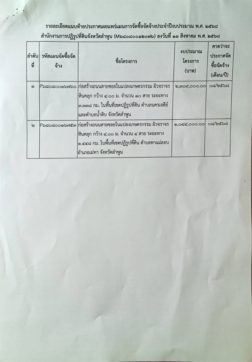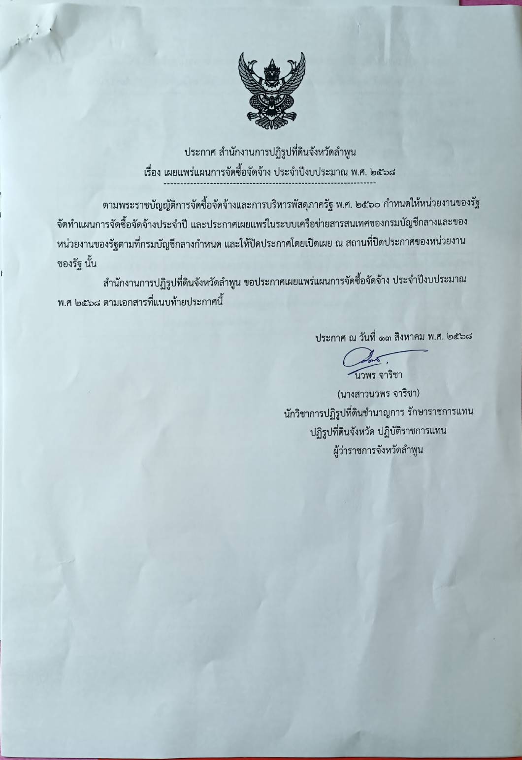 ประกาศ สำนักงานการปฏฺิรูปที่ดินจังหวัดลำพูน เรื่อง เผยแพร่แผนการจัดซื้อจัดจ้าง ประจำปีงบประมาณ พ.ศ. 2568