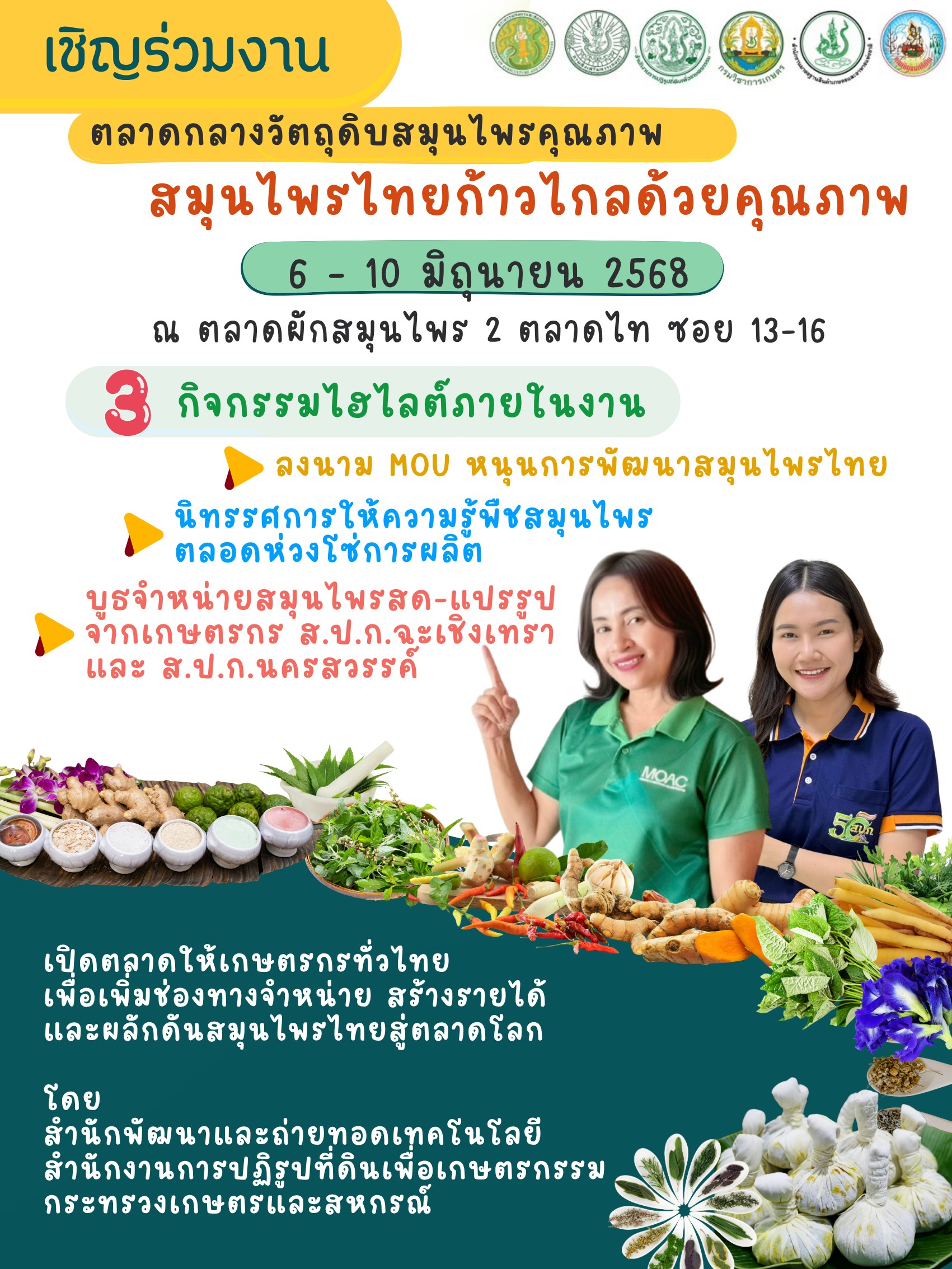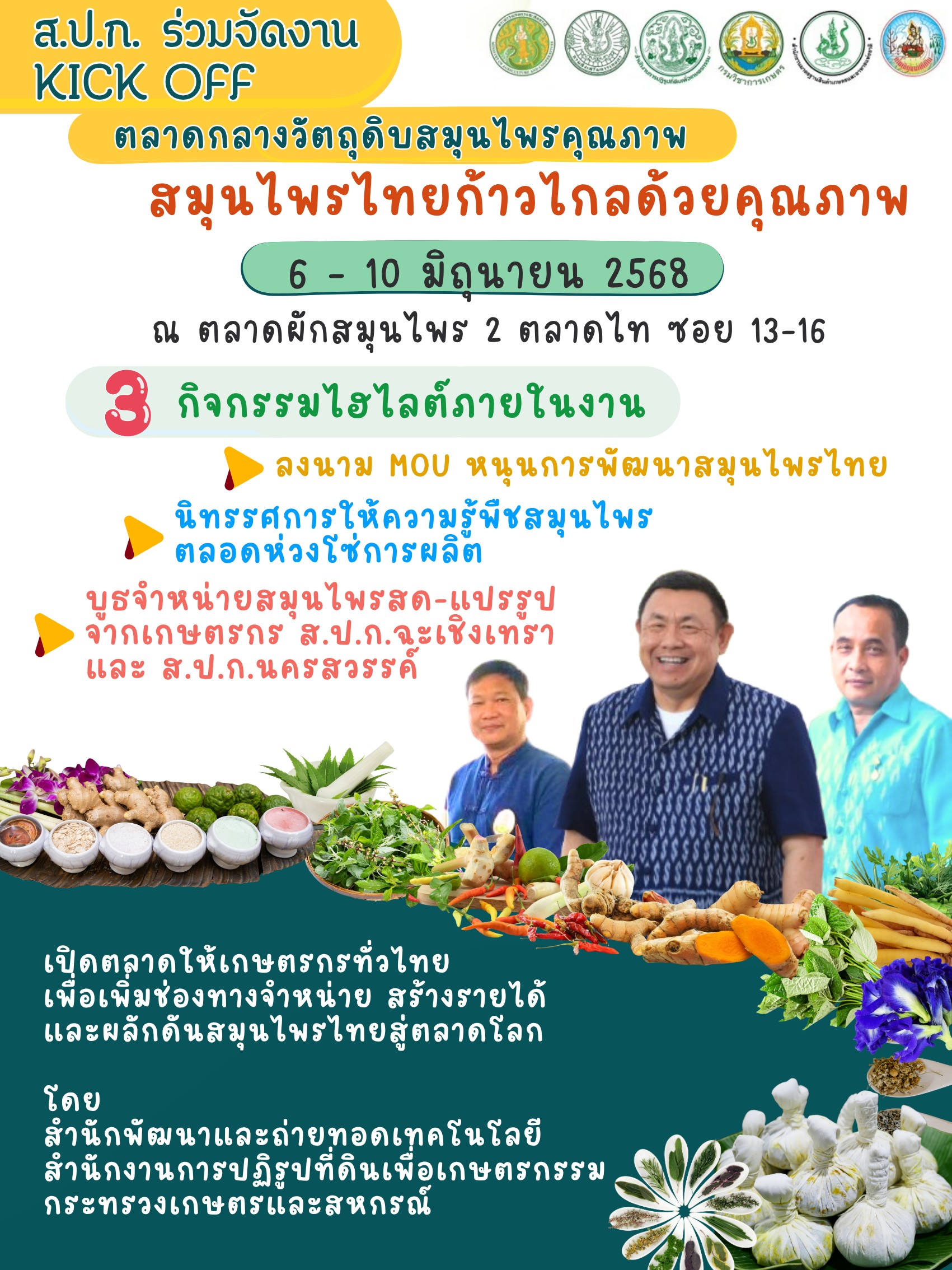 ส.ป.ก. ร่วมจัดงาน KICK OFF ตลาดกลางวัตถุดิบสมุนไพรคุณภาพ "สมุนไพรไทยก้าวไกลด้วยคุณภาพ" ในวันที่ 6 - 10 มิถุนายน 2568 ณ ตลาดผักสมุนไพร 2 ตลาดไท ซอย 13 - 16