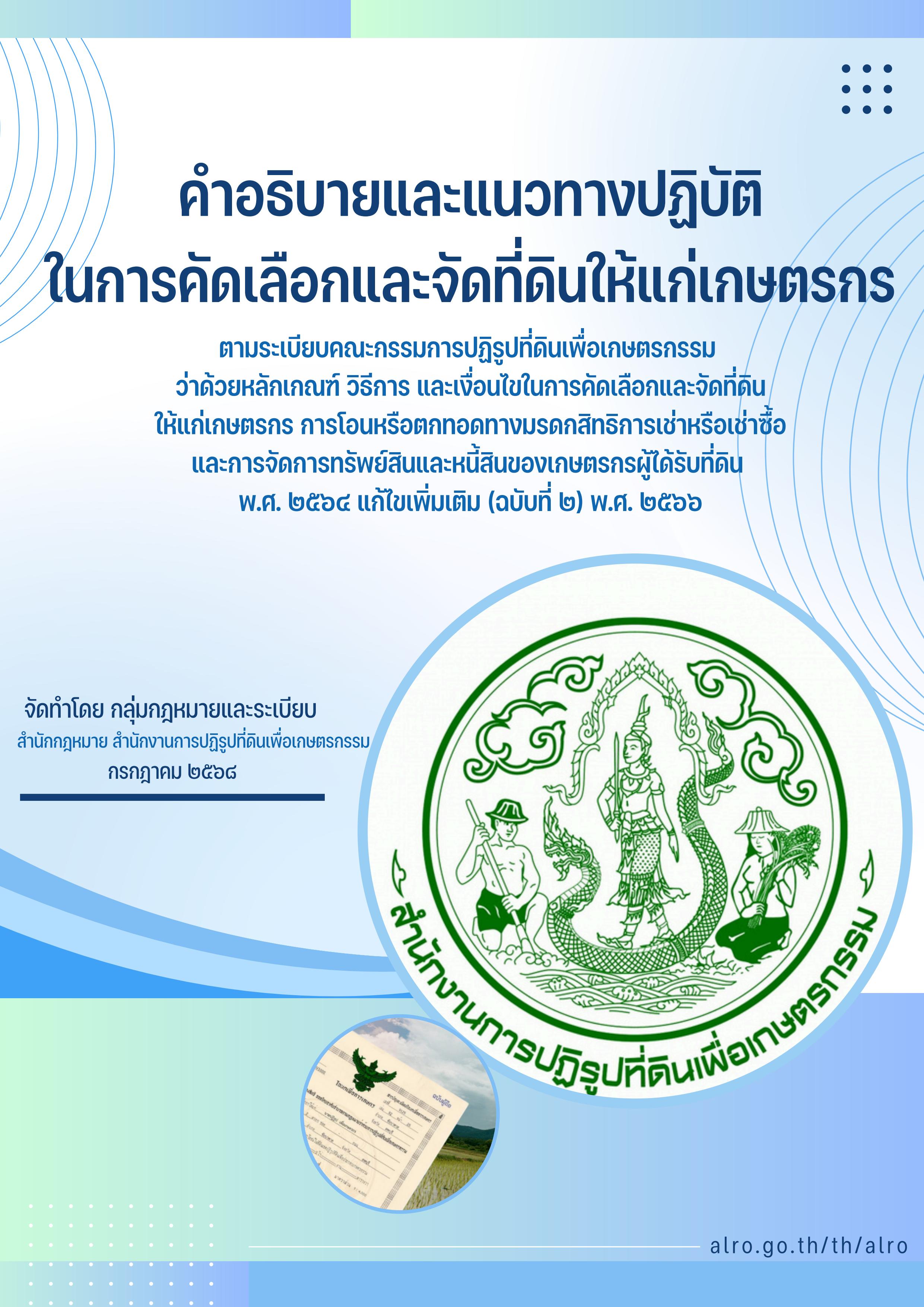 คำอธิบายหลักเกณฑ์ วิธีการ และเงื่อนไขในการคัดเลือกและจัดที่ดินให้แก่เกษตรกร การโอนหรือตกทอดทางมรดกสิทธิการเช่าหรือเช่าซื้อ และการจัดการทรัพย์สินและหนี้สินของเกษตรกรผู้ได้รับที่ดินจากสำนักงานการปฏิรูปที่ดินเพื่อเกษตรกรรม