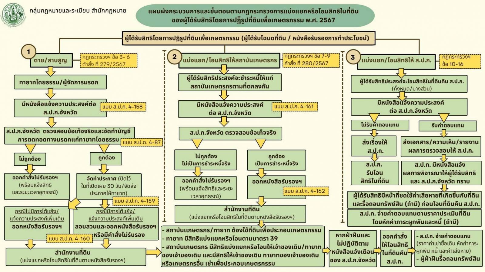 แผนผังกระบวนการและขั้นตอนตามกฎกระทรวงการแบ่งแยกหรือโอนสิทธิในที่ดินของผู้ได้รับสิทธิโดยการปฏิรูปที่ดินเพื่อเกษตรกรรม พ.ศ. 2567