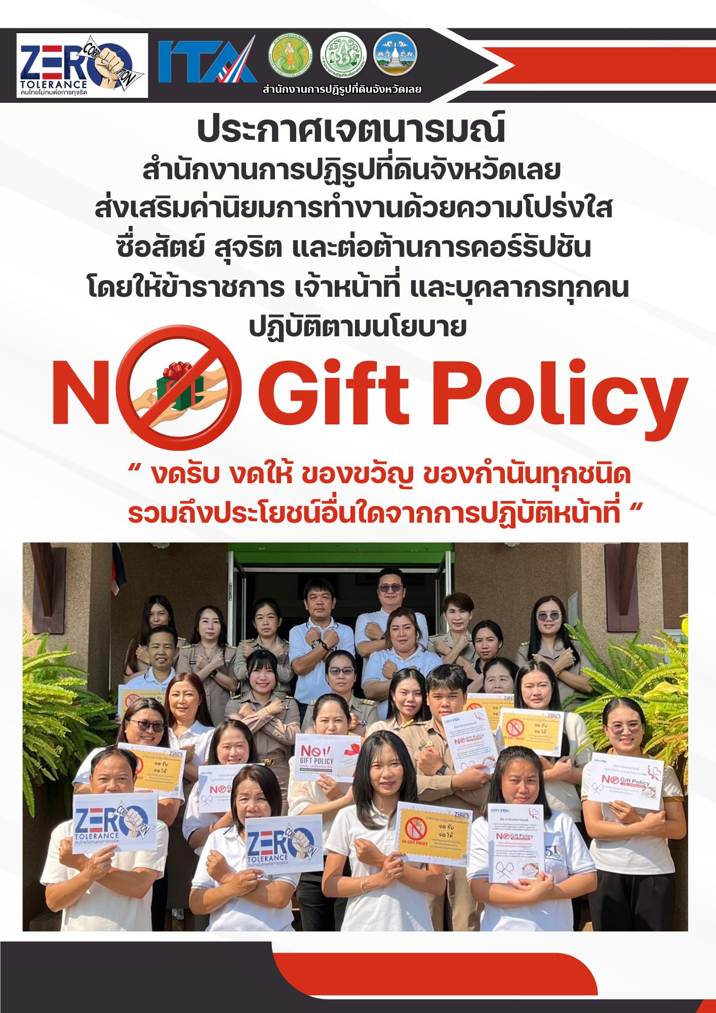 ประกาศเจตนารมณ์ สำนักงานการปฏิรูปที่ดินจังหวัดเลย ส่งเสริมค่านิยมการทำงานด้วยความโปร่งใส ซื่อสัตย์ สุจริต และต่อต้านการคอร์รัปชัน โดยให้ข้าราชการ เจ้าหน้าที่ และบุคลากรทุกคน ปฏิบัติตามนโยบาย