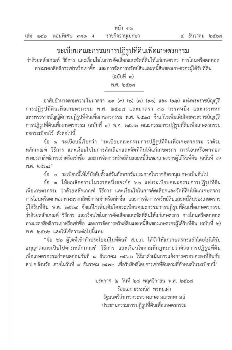 ปรส.ป.ก. ขยายเวลาการยื่นแจ้งครอบครองที่ดินสำหรับเกษตรกรที่ได้รับการจัดที่ดินจาก ส.ป.ก. ได้ขยายเวลาการยื่นแจ้งครอบครองที่ดิน เป็นภายในวันที่ 9 ธันวาคม 2570 ตามระเบียบคณะกรรมการปฏิรูปที่ดินเพื่อเกษตรกรรม (ฉบับที่ 3) พ.ศ. 2568 เมื่อพ้นกำหนดแล้วหากยังไม่ยื่นคำขอรับสิทธิตาม ข้อ 62 ส.ป.ก. จะต้องดำเนินการตามกฎหมาย เพื่อนำที่ดินกลับคืน และจัดให้เกษตรกรรายอื่น ต่อไป