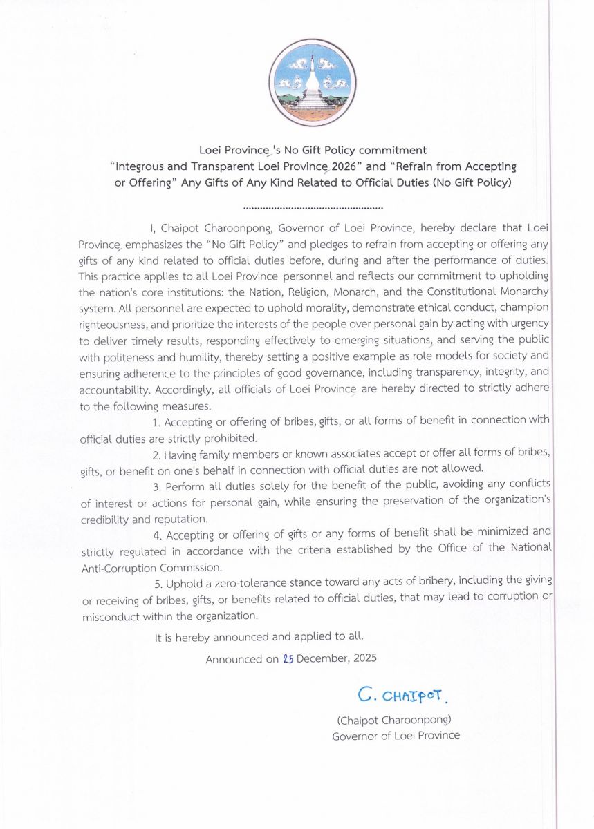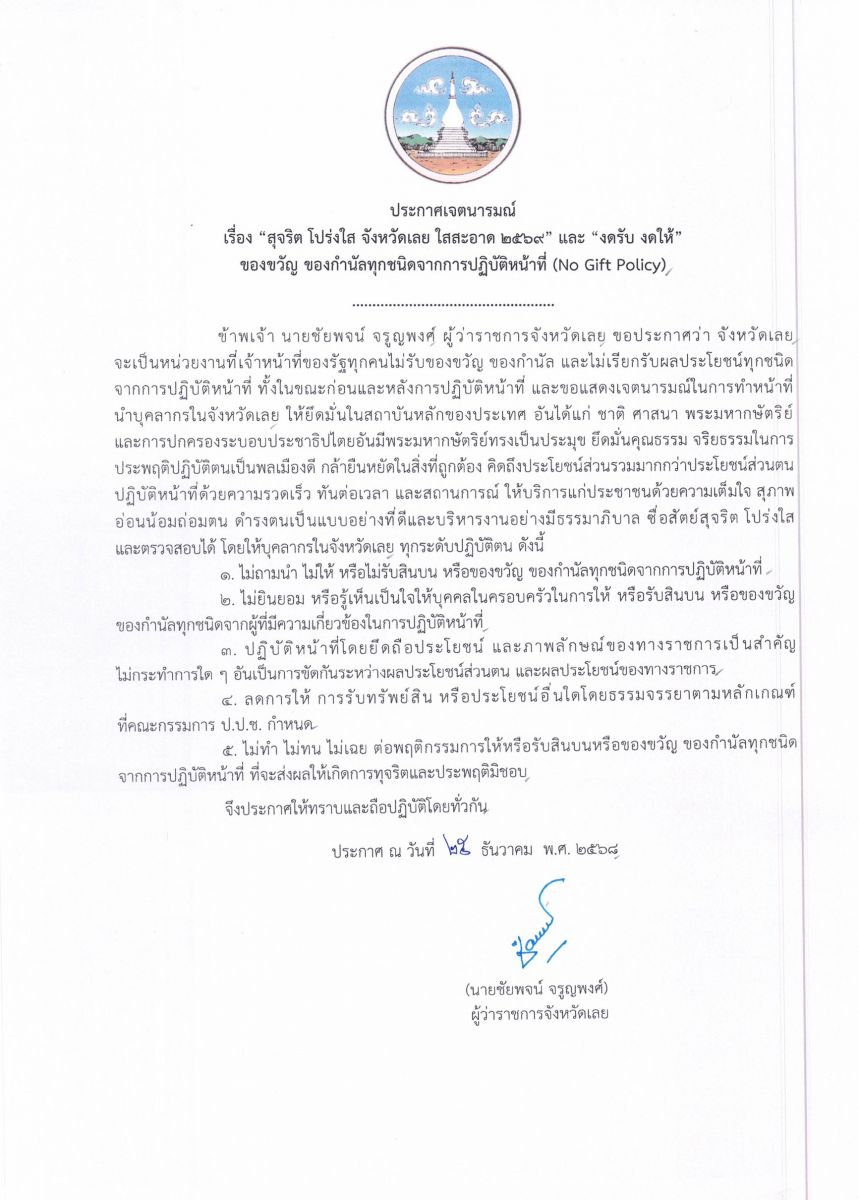 ประกาศเจตนารมณ์ เรื่อง "สุจริต โปร่งใส จังหวัดเลย ใสสะอาด 2569" และ "งดรับ งดให้" ของขวัญ ของกำนันทุกชนิดจากการปฏิบัติหน้าที่ (No Gift Policy)