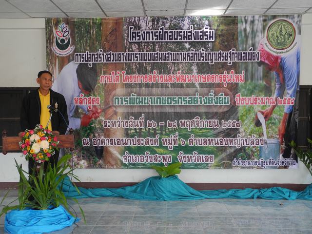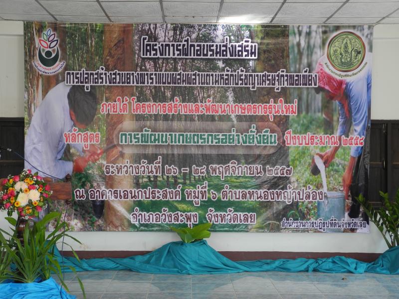 สำนักงานการปฏิรูปที่ดินจังหวัดเลย (ส.ป.ก.เลย) โดย กลุ่มยุทธศาสตร์และการปฏิรูปที่ดิน จัดอบรมเกษตรกรโครงการฝึกอบรมส่งเสริมการปลูกสร้างสวนยางพาราแบบผสมผสานตามปรัชญาเศรษฐกิจพอเพียง ภายใต้ โครงการสร้างและพัฒนาเกษตรกรรุ่นใหม่ หลักสูตร ?การพัฒนาเกษตรกรอย่างยั่งยืน? ปีงบประมาณ ระหว่างวันที 26-28 พฤศจิกายน 2557ณ อาคารเอนกประสงค์ หมู่ 6 ตำบลหนองหญ้าปล้อง อำเภอวังสะพุง จังหวัดเลย โดยมี นายประสิทธิ์ พยอมหอม ผู้อำนวยการ กลุ่มยุทธศาสตร์และการปฏิรูปที่ดิน กล่าวรายงานการจัดอบรม ต่อประธาน นายวัชรินทร์ วากะมะนนท์ ปฏิรูปที่ดินจังหวัดเลย และหัวหน้าส่วนราชการที่เข้าร่วมงาน ซึ่งมีเกษตรกรที่อยู่ในเขตปฏิรูปที่ดินและได้รับหนังสืออนุญาตให้เข้าทำประโยชน์ในที่ดิน (ส.ป.ก. 4-01) เข้าร่วมอบรมในครั้งนี้ จำนวน 51 ราย เนื้อหาของการอบรมให้ความสำคัญ ?การพัฒนาเกษตรกรอย่างยั่งยืน? ตามปรัชญาเศรษฐกิจพอเพียง จากวิทยากรจาก สำนักงานตรวจบัญชีสหกรณ์เลย, สำนักงานกองทุนสงเคราะห์การทำสวนยางจังหวัดเลย, สำนักงานสหกรณ์เลย, สถานีพัฒนาที่ดินเลย และเจ้าหน้าที่จากสำนักงานการปฏิรูปที่ดิน