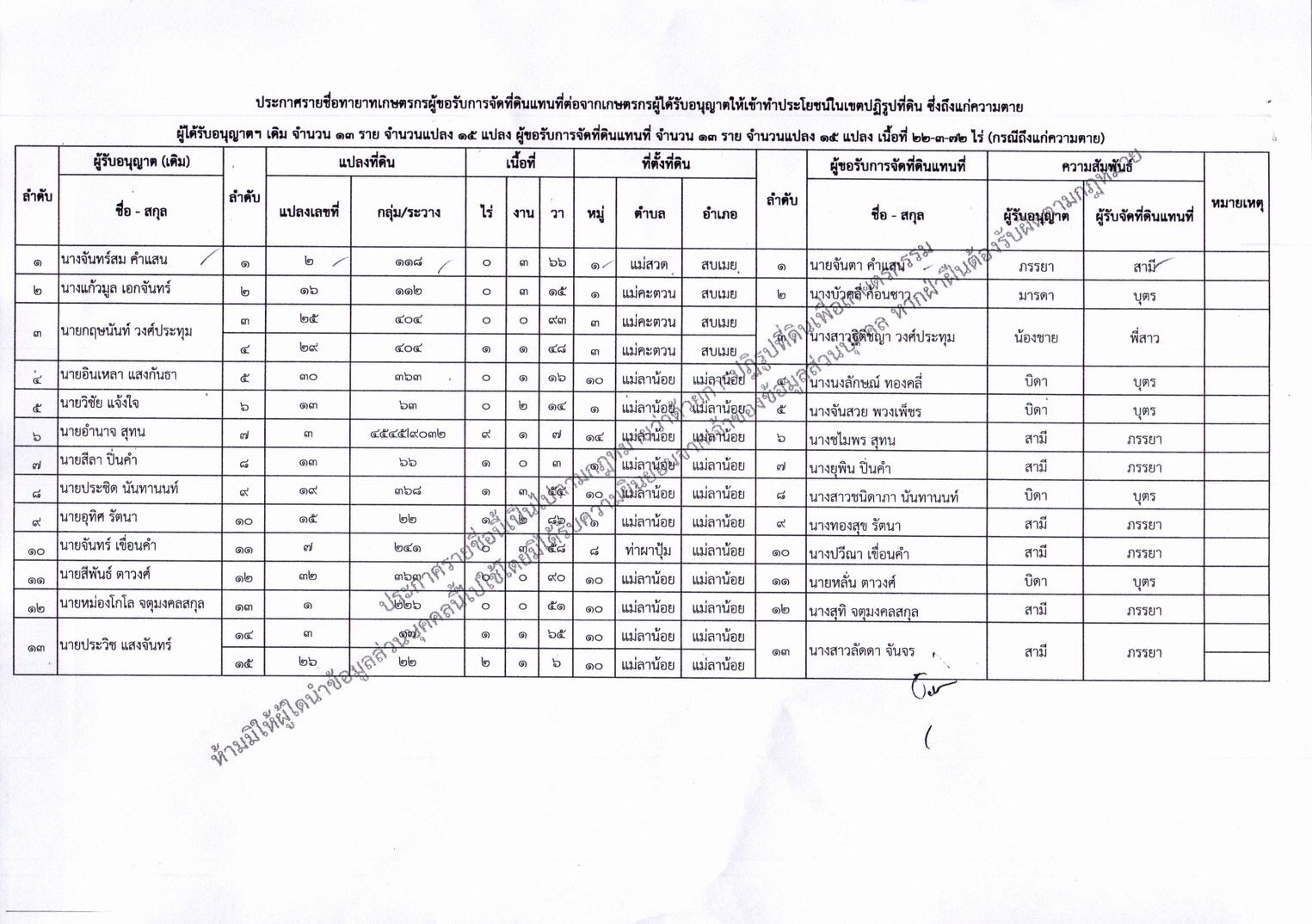 ประกาศสำนักงานการปฏิรูปที่ดินจังหวัดแม่ฮ่องสอน เรื่อง รายชื่อทายาทเกษตรกรผู้ขอรับการจัดที่ดินแทนที่ต่อจากเกษตรกรผู้ได้รับอนุญาตให้เข้าทำประโยชน์ในเขตปฏิรูปที่ดิน ซึ่งถึงแก่ความตาย