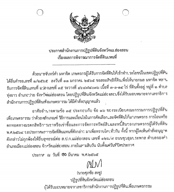 ประกาศสำนักงานการปฏิรูปที่ดินจังหวัดแม่ฮ่องสอน เรื่อง ผลการพิจารณาการจัดที่ดินแทนที่ แปลงเลขที่ 35 ระวางที่ 4647i4036