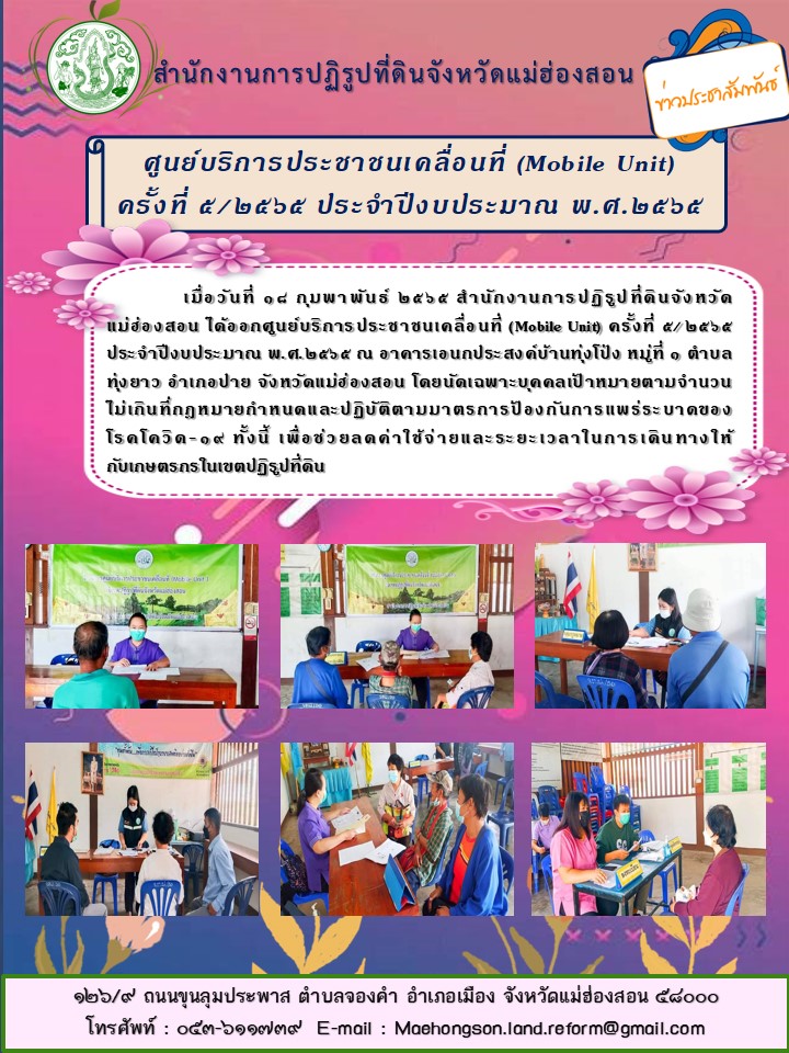 เมื่อวันที่ ๑๘ กุมพาพันธ์ ๒๕๖๕ สำนักงานการปฏิรูปที่ดินจังหวัดแม่ฮ่องสอน ได้ออกศูนย์บริการประชาชนเคลื่อนที่ (Mobile Unit) ครั้งที่ ๕/๒๕๖๕ ประจำปีงบประมาณ พ.ศ.๒๕๖๕ ณ อาคารเอนกประสงค์บ้านทุ่งโป่ง หมู่ที่ ๑ ตำบล ทุ่งยาว อำเภอปาย จังหวัดแม่ฮ่องสอน โดยนัดเฉพาะบุคคลเป้าหมายตามจำนวนไม่เกินที่กฎหมายกำหนดและปฏิบัติตามมาตรการป้องกันการแพร่ระบาดของโรคโควิด-๑๙ ทั้งนี้ เพื่อช่วยลดค่าใช้จ่ายและระยะเวลาในการเดินทางให้กับเกษตรกรในเขตปฏิรูปที่ดิน