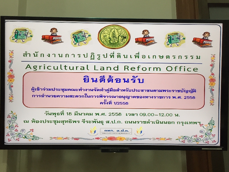 เมื่อวันพุธ ที่ 18 มีนาคม 2558 เวลา 09.00 น. ณ ห้องประชุมสุทธิพร จีระพันธุ ส.ป.ก. ถนนราชดำเนินนอก กรุงเทพฯ กลุ่มพัฒนาระบบบริหาร ส.ป.ก. ร่วมกับสำกฎหมาย ส.ป.ก. ได้จัดประชุมคณะทำงานจัดทำคู่มือสำหรับประชาชนตามพระราชบัญญัติการอำนวยความสะดวกในการพิจารณาอนุญาตของทางราชการ พ.ศ. 2558 ครั้งที่ 1/2558 โดยได้รับเกียรติจากท่านเลขาธิการ ส.ป.ก. (นายสรรเสริญ อัจจุตมานัส) ได้ให้เกียติเป็นประธานในการประชุม ร่วมกับคณะทำงาน ประกอบด้วย ผอ. กลุ่ม/กอง/สำนัก/ศูนย์/ปฏิรูปที่ดินจังหวัด และผู้เกี่ยวข้อง เข้าร่วมประชุม เพื่อปรึกษาหารื้อ ให้ข้อคิดเห็นในเรื่องของพระราชบัญญัติการอำนวยความสะดวกในการพิจารณาอนุญาตของทางราชการ พ.ศ.2558 โดยกำหนดให้หน่วยงานของรัฐ ที่มีภารกิจเกี่ยวกับการพิจารณาการออกใบอนุญาต การอนุมัติ การจดทะเบียน การขึ้นทะเบียน และการรับแจ้ง ตามกฎหมายหรือกฎ จะต้องดำเนินการจัดทำคู่มือสำหรับประชาชนทุกงานบริการ เพื่อให้การบริการและข้อมูลที่ชัดเจนเกี่ยวกับการขออนุญาต เพื่อเป็นการอำนวยความสะดวกให้แก่ประชาชน จากการประชุมครั้งนี้เป็นการศึกษา รวบรวมกระบวนงานของ ส.ป.ก. เพื่อให้การดำเนินการจัดทำคู่มือสำหรับประชาชน บรรลุวัตถุประสงค์ตามที่พระราชบัญญัติดังกล่าวกำหนด