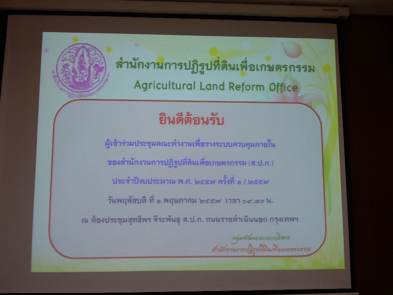 เมื่อวันพฤหัสบดี ที่ 1 พฤษภาคม 2557 กลุ่มพัฒนาระบบบริหาร (กพร. ส.ป.ก.) โดย น.ส.นิษฐ์ธิมา จันทร์เขียว นักวิชาการปฏิรูปที่ดินชำนาญการ รักษาการในตำแหน่งผู้อำนวยการกลุ่มพัฒนาระบบบริหาร ส.ป.ก. ในฐานะคณะทำงานและเลขานุการ ได้จัดการประชุมคณะทำงานเพื่อวางระบบควบคุมภายในของ ส.ป.ก. ประจำปีงบประมาณ พ.ศ.2557 ครั้งที่ 1 / 2557 โดยได้รับเกียรติจากท่านรองเลขาธิการ ส.ป.ก. (นางเปรมจิต สังขพงษ์) ประธานคณะทำงาน ให้เกียรติเป็นประธานในการประชุมครั้งนี้ เพื่อเป็นการเตรียมความพร้อมในการดำเนินการวางระบบการควบคุมภายในของ ส.ป.ก. โดยร่วมกันกับคณะทำงานของแต่ละ สำนัก/กอง/ศูนย์/กลุ่ม ณ ห้องประชุมสุทธิพร จีระพันธุ ส.ป.ก. ถนนราชดำเนินนอก กรุงเทพฯ