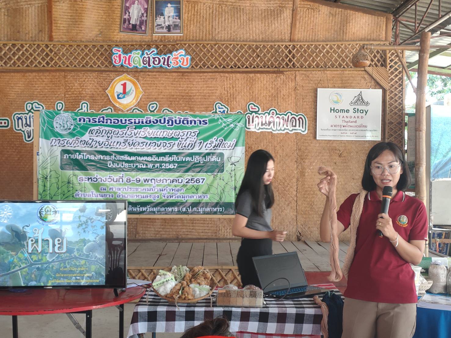 วันที่ 8-9 พฤษภาคม 2567 นางสาวกุหลาบ สุนนท์ ปฏฺิรูปที่ดินจังหวัดมุกดาหาร มอบหมายให้นางสาวยุพาวรรณ หนันลา นักวิชาการปฏิรูปที่ดินชำนาญการ จัดฝึกอบรมและมอบปัจจัยการผลิต ภายใต้โครงการส่งเสริมเกษตรอินทรีย์ในเขตปฏิรูปที่ดิน ปีงบประมาณ พ.ศ. 2567 ส่งเสริมให้เกษตรกรปลูกฝ้ายอินทรีย์ ลด ละ เลิก การใช้สารเคมี อิ้ว เข็น ปั่นด้าย สืบสานภูมิปัญญาท้องถิ่น สร้างรายได้ให้กับครอบครัว โดยมี นางสาววินิภา ชาลีคาร นักวิชาการเกษตรชำนาญการ ศูนย์วิจัยและพัฒนาการเกษตรมุกดาหาร ให้ความรู้เกี่ยวกับ พันธุ์ฝ้าย เทคโนโลยีการผลิต การบริหารจัดการแปลง รวมถึงการใช้สารชีวภัณฑ์ มีเกษตรกรเข้าร่วมโครงการ จำนวน 20 ราย ณ ศาลาประชาคมบ้านคำพอก ตำบลโนนยาง อำเภอหนองสูง จังหวัดมุกดาหาร