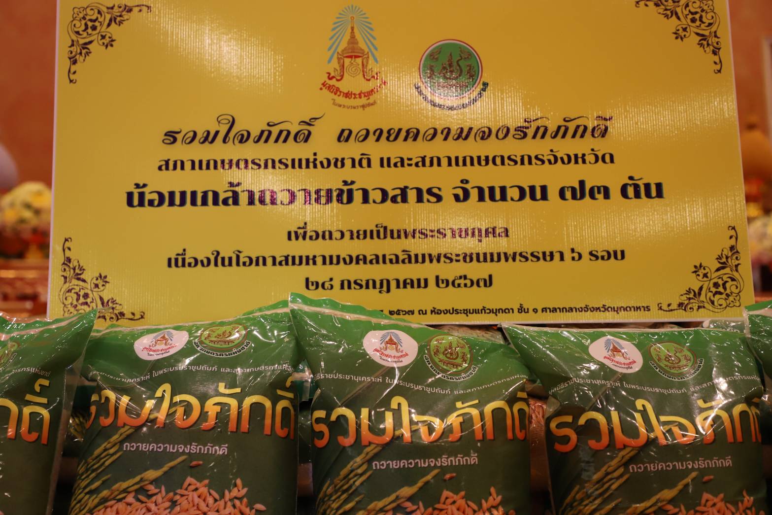วันที่ 2 ธันวาคม 2567 นางสาวกุหลาบ สุนนท์ ปฏิรูปที่ดินจังหวัดมุกดาหาร มอบหมายให้นางจิรัติกาญจน์ บุญทา หัวหน้าฝ่ายบริหารทั่วไป ร่วมโครงการสภาเกษตรกรแห่งชาติ และสภาเกษตรกรจังหวัด รวมใจภักดิ์ ถวายความจงรักภักดี น้อมเกล้าถวายข้าวสาร จำนวน 73 ตัน เพื่อถวายเป็นพระราชกุศล เฉลิมพระเกียรติพระบาทสมเด็จพระเจ้าอยู่หัว เนื่องในโอกาสพระราชพิธีมหามงคลเฉลิมพระชนมพรรษา 6 รอบ 28 กรกฎาคม 2567 ณ ห้องประชุมแก้วมุกดาชั้น 1 ศาลากลางจังหวัดมุกดาหาร โดยมีนายวรญาณ บุญณราช ผู้ว่าราชการจังหวัดมุกดาหาร ในฐานะประธานกรรมการมูลนิธิราชประชานุเคราะห์ประจำจังหวัดเป็นประธานในพิธีรับมอบข้าวสาร และส่งต่อเพื่อช่วยเหลือบรรเทาความเดือดร้อนแก่ผู้ประสบภัยน้ำท่วม รวมถึงสนับสนุนการดำเนินงานของโรงเรียนราชประชานุเคราะห์ทั่วประเทศต่อไป