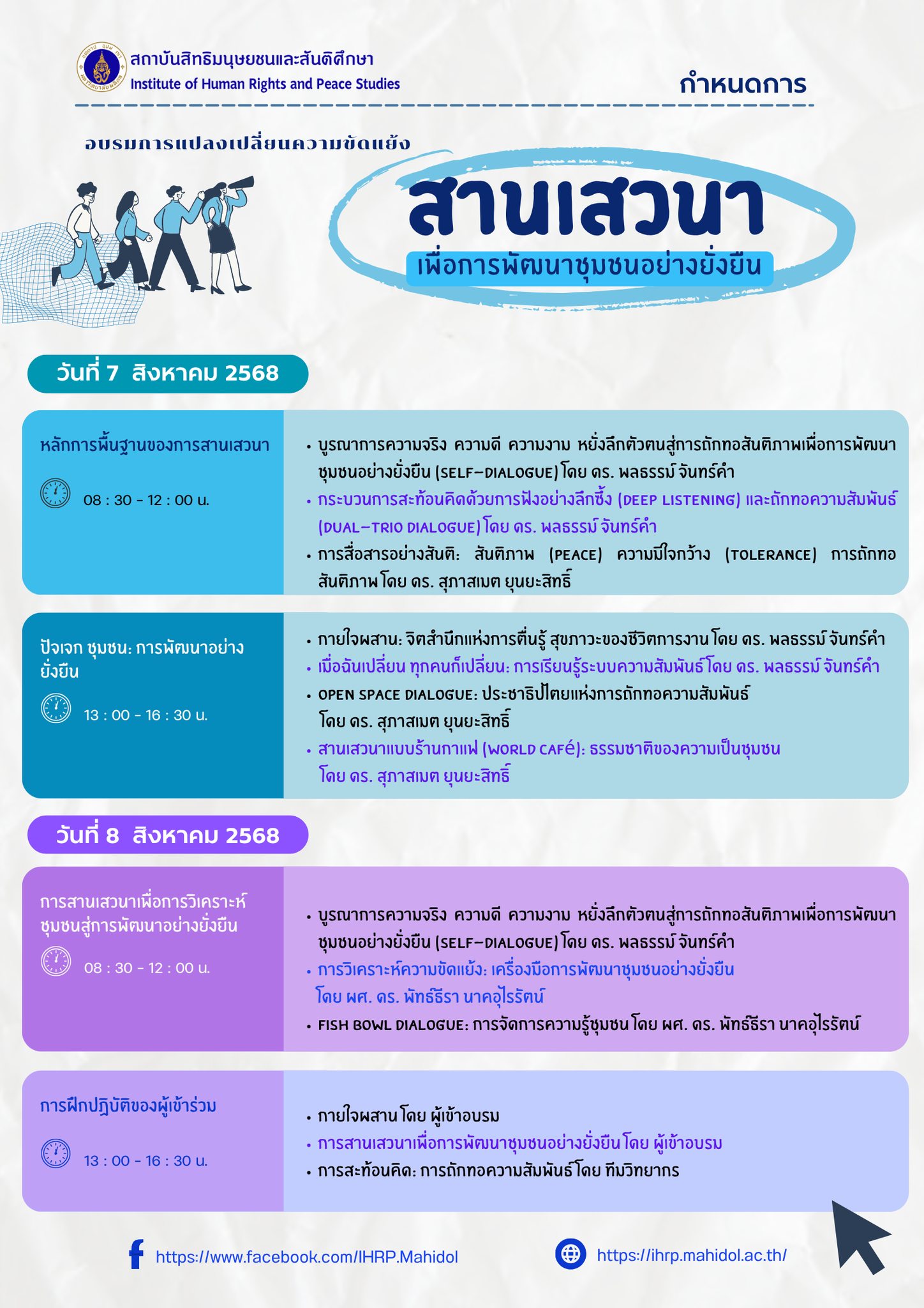 "โครงการอบรมการแปลงเปลี่ยนความขัดแย้ง: สานเสวนา เพื่อการพัฒนาชุมชนอย่างยืน"จัดขึ้นโดยสถาบันสิทธิมนุษยชนและสันติศึกษา มหาวิทยาลัยมหิดล เพื่อพัฒนาทักษะการสานเสวนาให้สามารถใช้ได้ในชีวิตประจำวัน การทำงานชุมชนได้อย่างมีประสิทธิภาพ “สานเสวนาเพื่อการพัฒนาชุมชนอย่างยั่งยืน” จะมีประโยชน์ต่อผู้เข้าอบรมให้สามารถนำทักษะการจัด สานเสวนาไปใช้ได้ทั้งในชีวิตประจำวัน การทำงาน การพัฒนาชุมชน การสร้างทีมในองค์กร