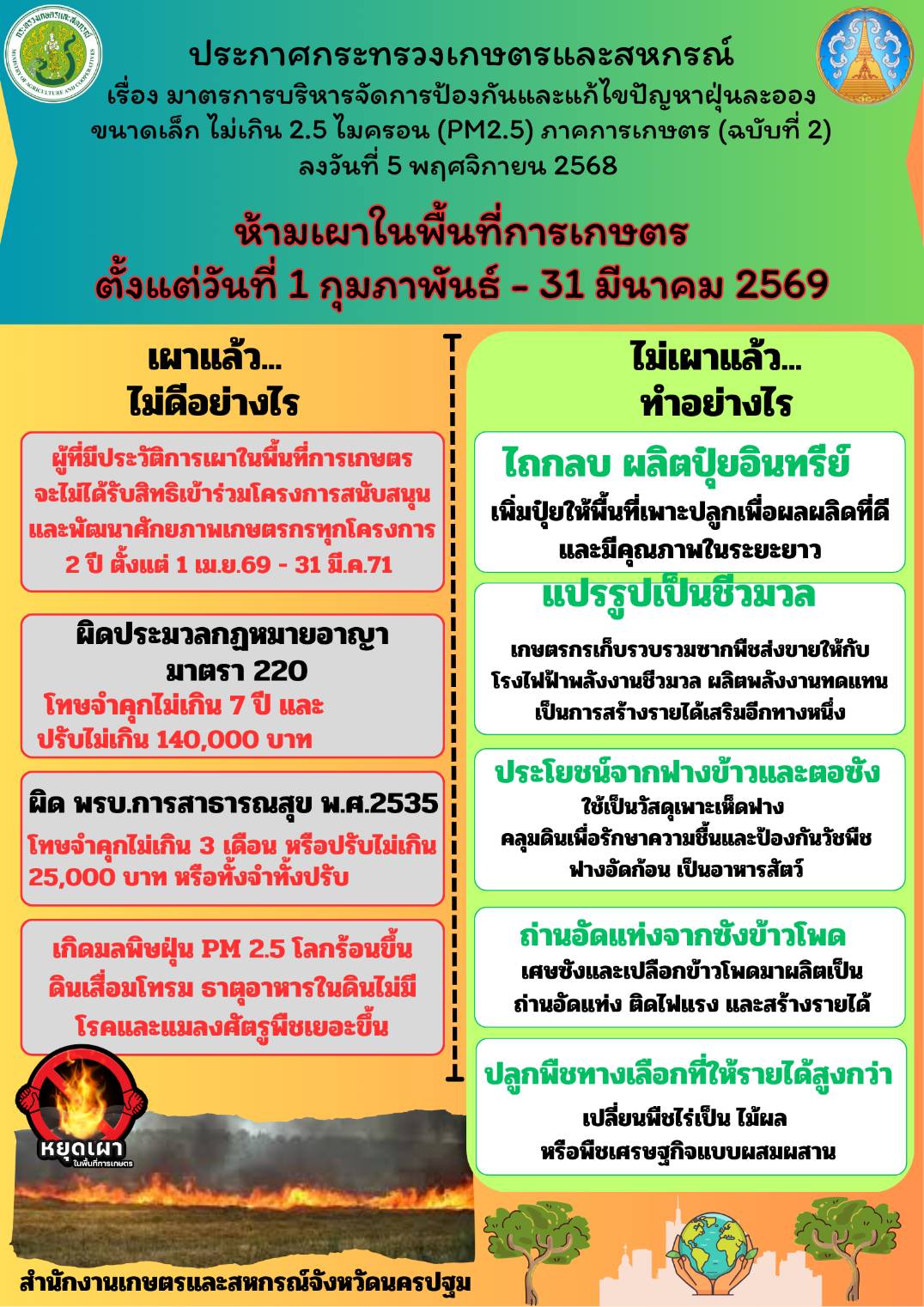 จังหวัดนครปฐม ขอแจ้งมาตรการแก้ไขปัญหาการเผาในพื้นที่เกษตรกรรม ของกระทรวงเกษตรและสหกรณ์ กรณีตรวจพบว่า มีการเผาในพื้นที่เกษตรกรรมของเกษตรกรรายใด ตั้งแต่วันที่ 1 กุมภาพันธ์ 2569 จนถึงวันที่ 31 มีนาคม 2569 จะถูกตัดสิทธิในการเข้าร่วมโครงการเพื่อพัฒนาศักยภาพหรือสิทธิอื่นๆ จากภาครัฐ เป็นเวลา 2 ปี ดังนั้น เพื่อรักษาสิทธิของพี่น้องเกษตรกรในการได้รับการดูแลสนับสนุนจากภาครัฐ และเพื่อสุขภาพของประชาชน จังหวัดนครปฐมจึงขอให้พี่น้องเกษตรกรงดการเผาทุกกรณี รวมทั้งเฝ้าระวังพื้นที่ของตนเองมิให้ถูกเผาโดยไม่ได้เจตนาอีกด้วย ภายใต้ปฏิบัติการ “นครปฐมหยุดฝุ่นพิษ เพื่อชีวิตที่ปลอดภัย”
