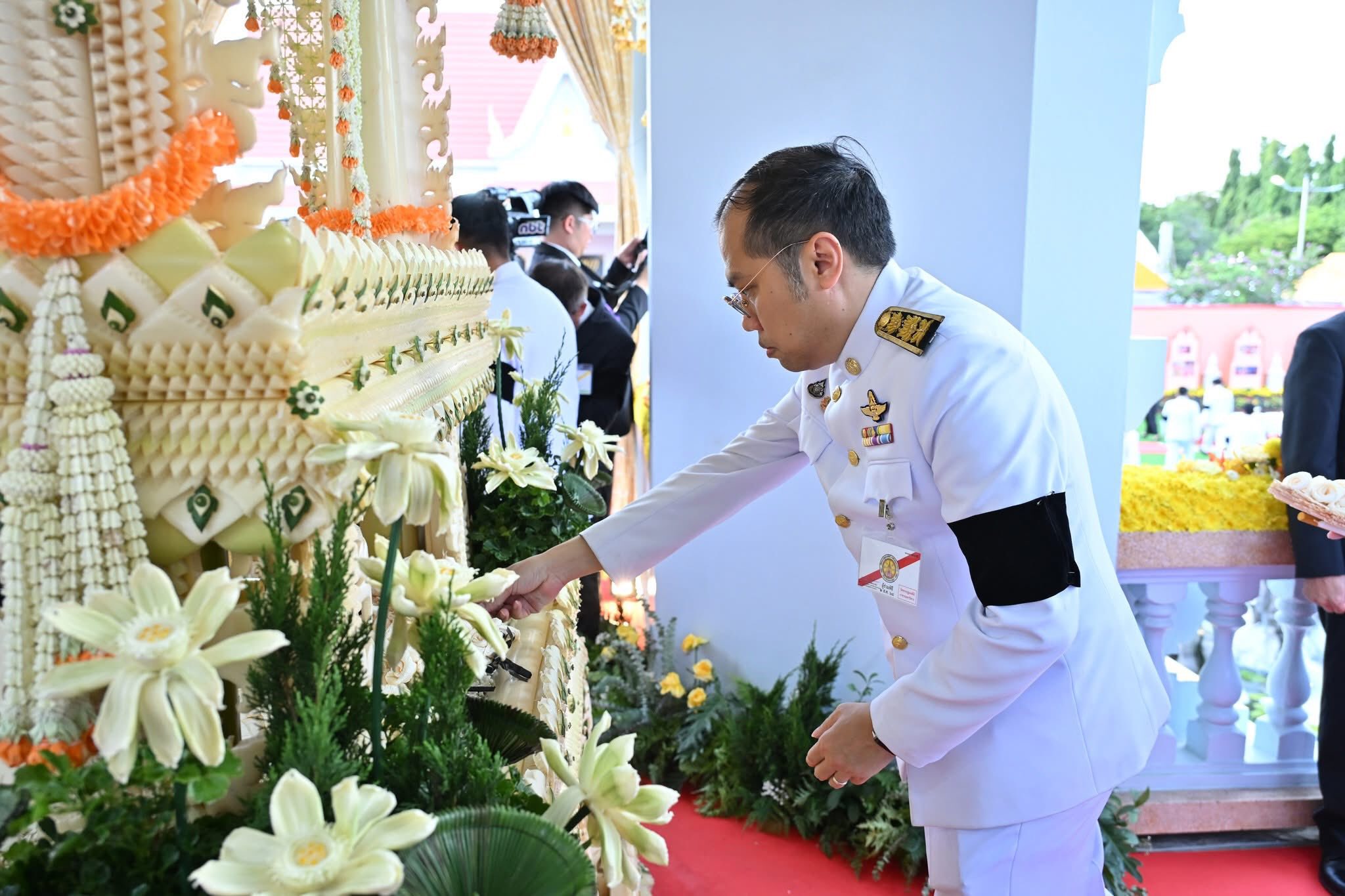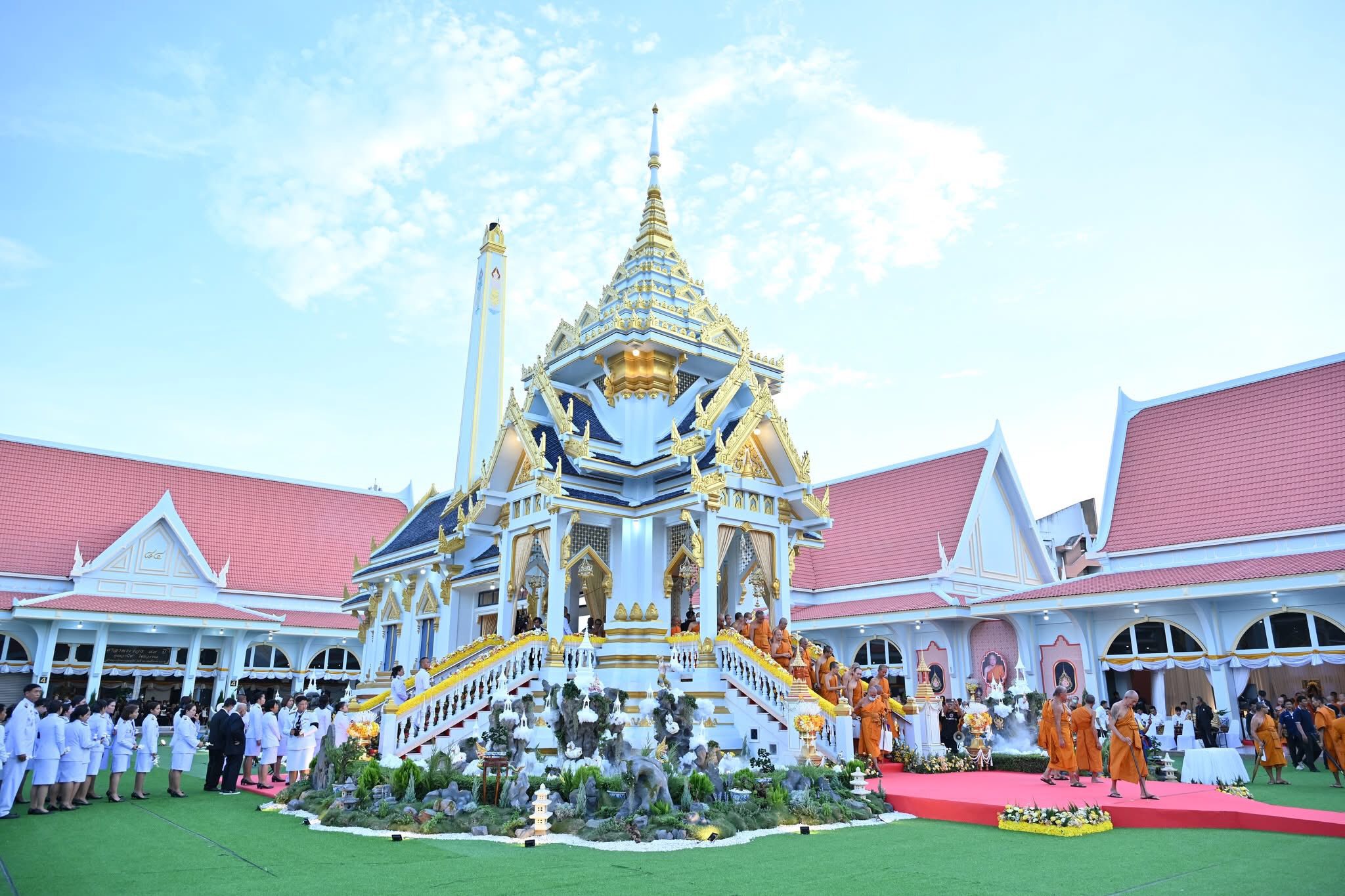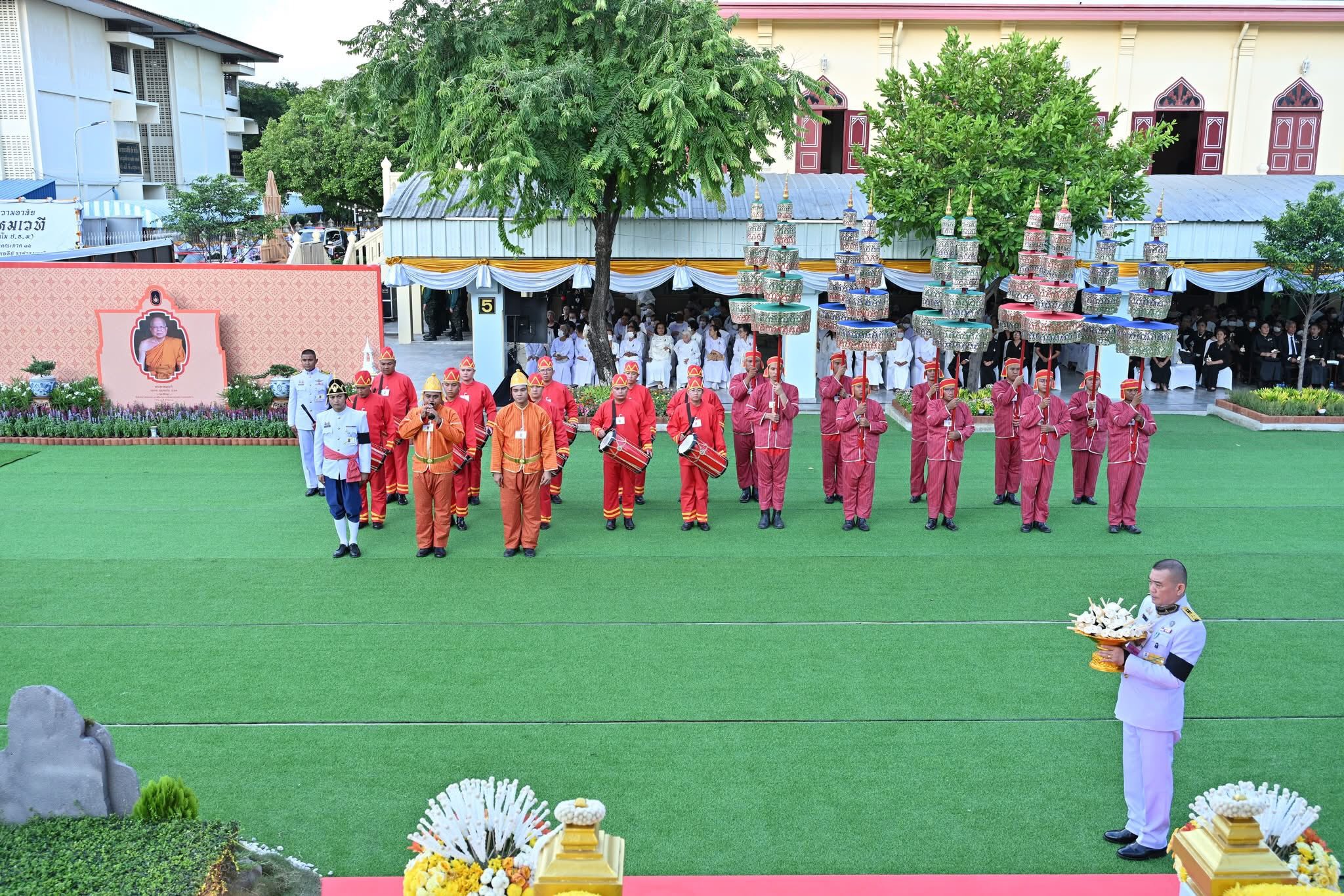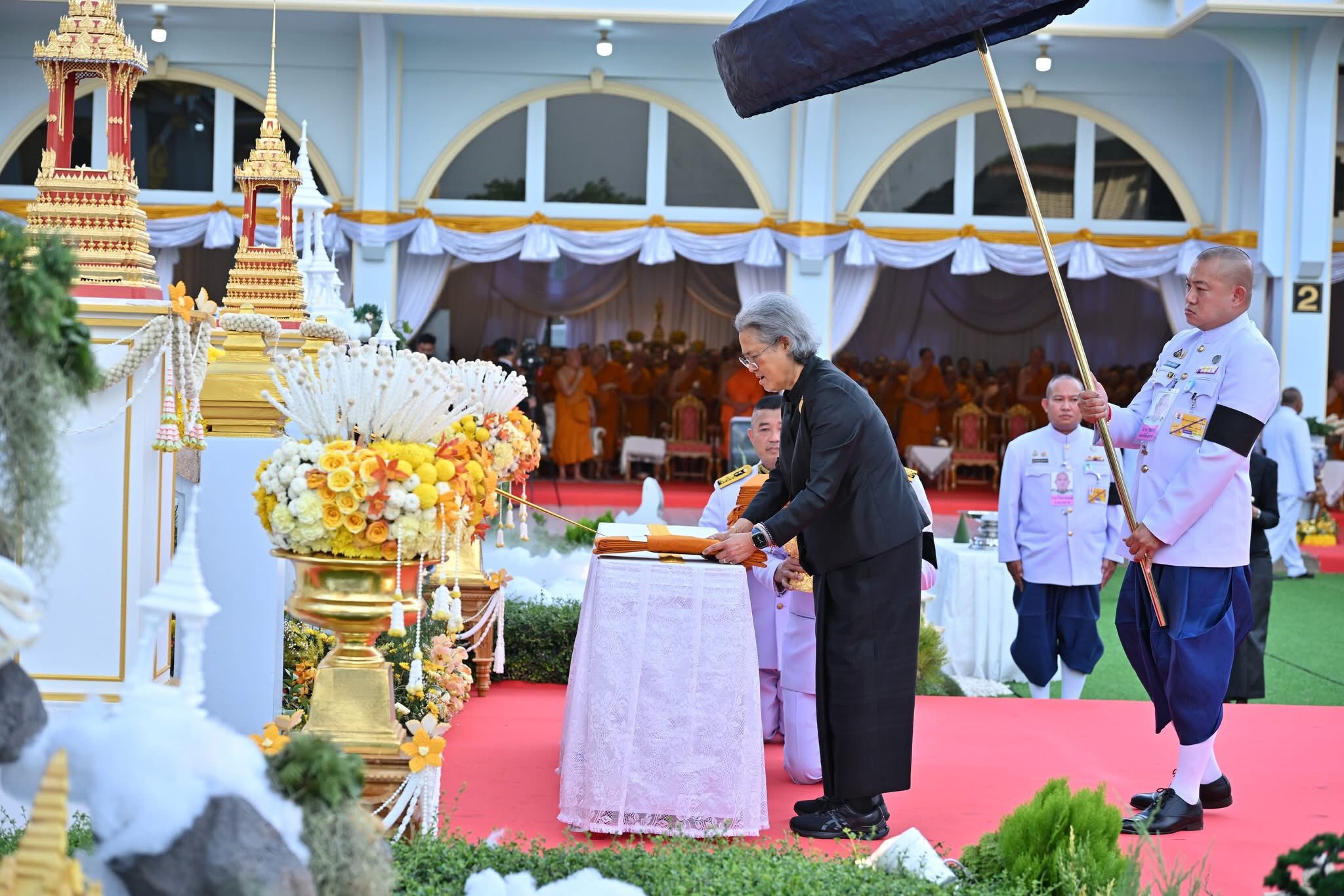 ในการนี้ ทรงทอดผ้าไตร 10 ไตร พระสงฆ์ 10 รูป บังสุกุล จากนั้นทรงหยิบกระทงข้าวตอกดอกไม้วางที่บนพาน ทรงจุดธูปเทียนดอกไม้จันทน์ พระราชทานเพลิง โดยมีพระเถรานุเถระ อดีตผู้ว่าราชการจังหวัดนครปฐม รองผู้ว่าราชการจังหวัดนครปฐม หัวหน้าส่วนราชการ ข้าราชการ ทหาร ตำรวจ และเจ้าหน้าที่จากหน่วยงานต่างๆ ตลอดจนประชาชน ร่วมพิธีเป็นจำนวนมาก