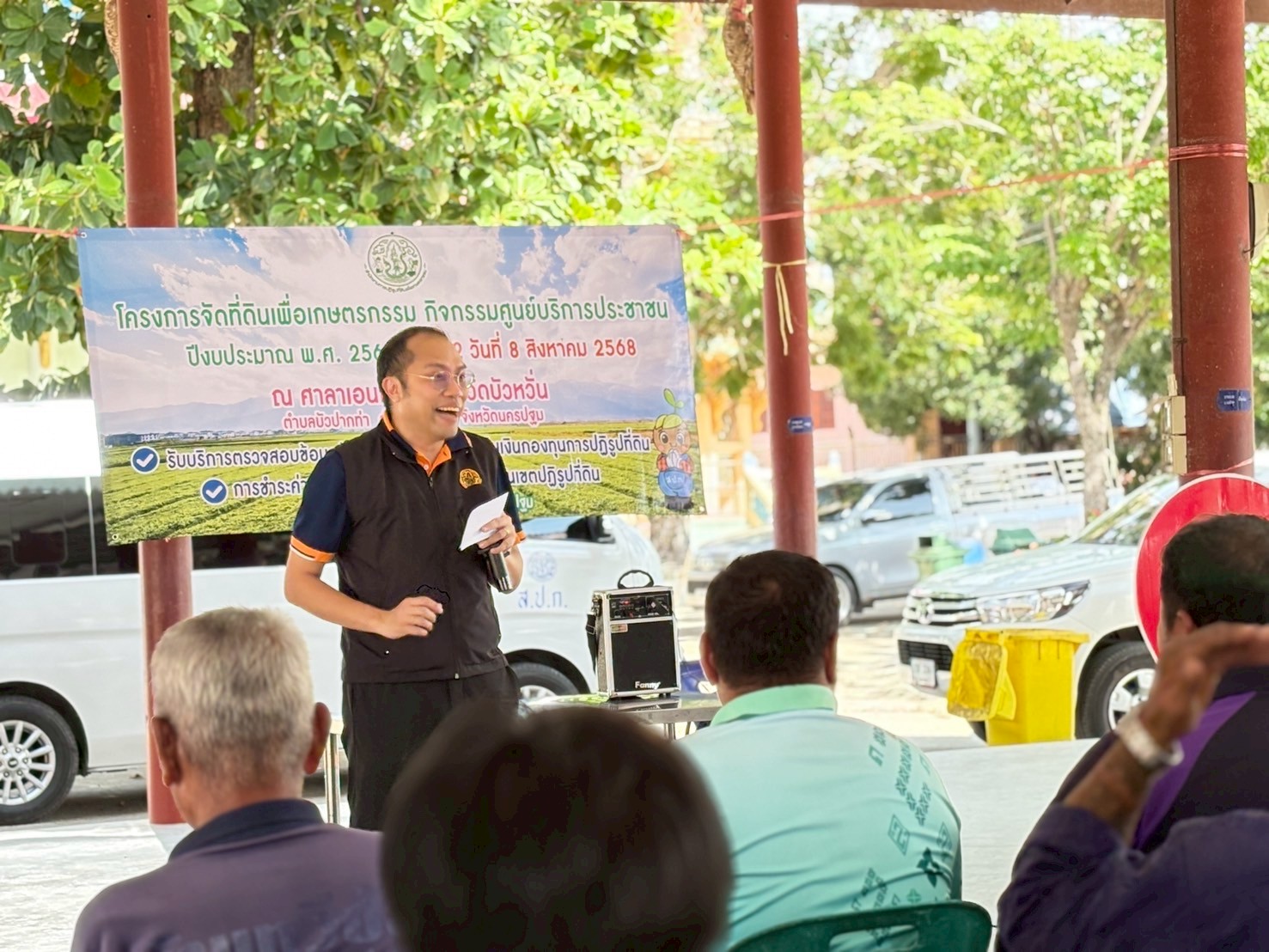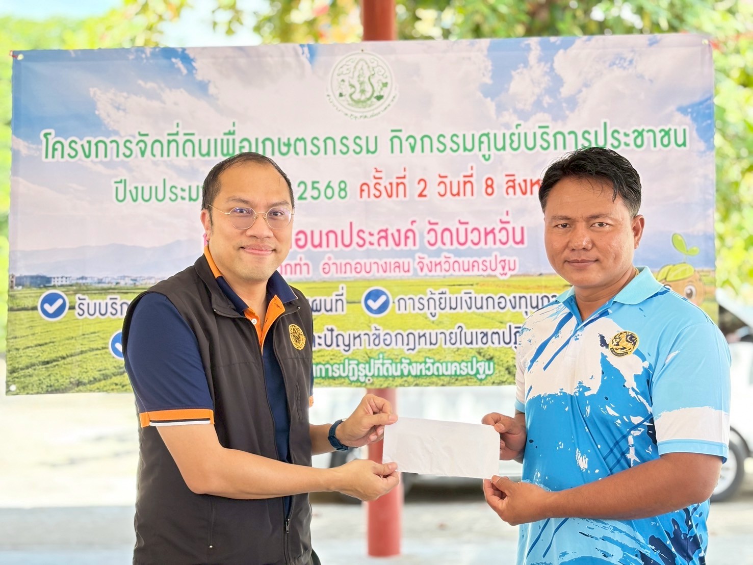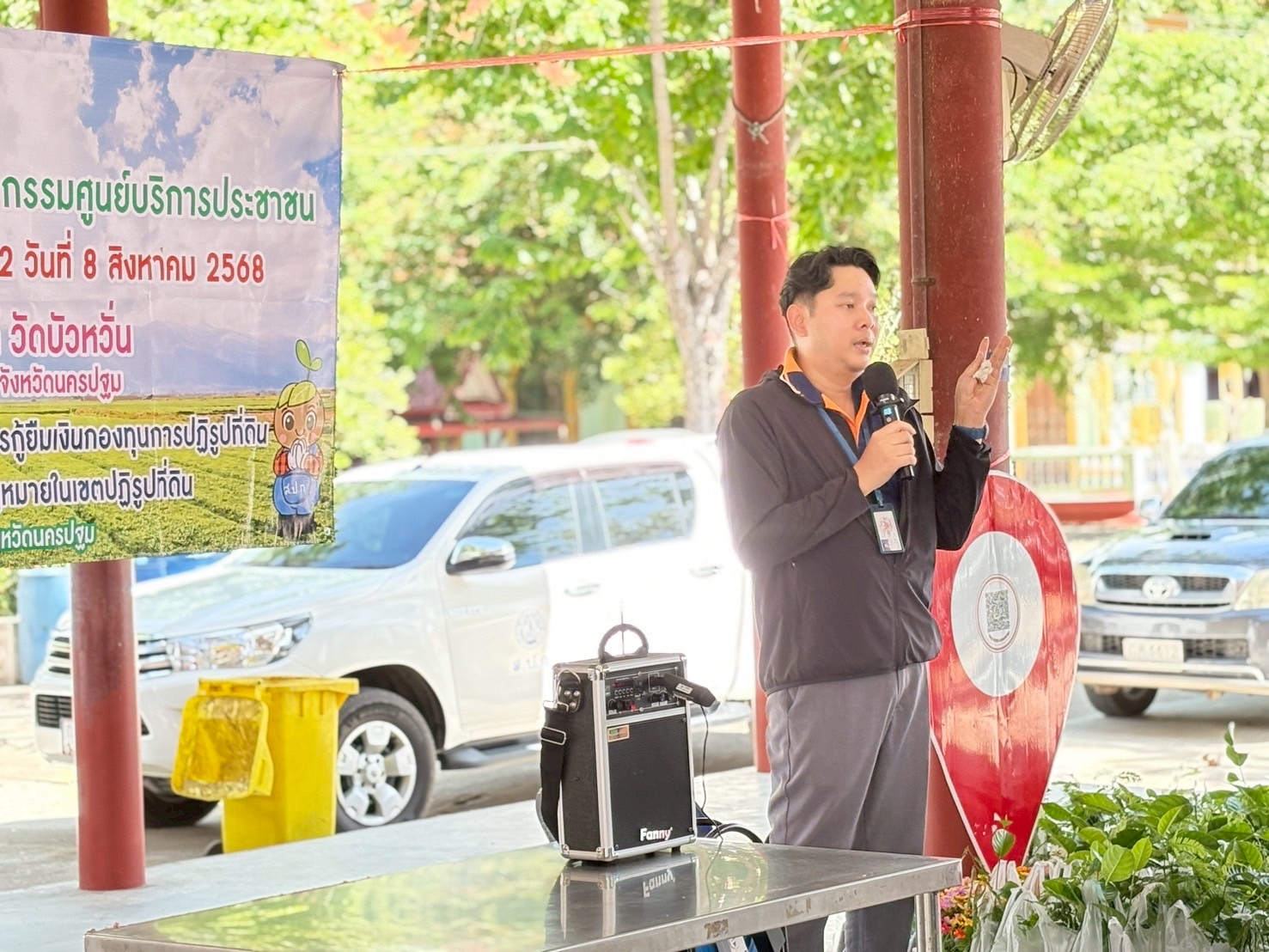 วันที่ 8 สิงหาคม 2568 ส.ป.ก.นครปฐม โดยนายสุพัฒ มูลพฤกษ์ ปฏิรูปที่ดินจังหวัดนครปฐม พร้อมด้วยข้าราชการ และเจ้าหน้าที่ ส.ป.ก.นครปฐม จัดโครงการศูนย์บริการประชาชนในลักษณะศูนย์บริการเคลื่อนที่ Mobile Unit ในระดับอำเภอ ครั้งที่ 2 เพื่อเป็นการช่วยเหลือเกษตรกรในเขตปฏิรูปที่ดินที่อยู่ห่างไกลได้มารับบริการ รวมทั้งช่วยลดค่าใช้จ่ายและประหยัดเวลาในการเดินทางมาติดต่อราชการในตัวจังหวัด พร้อมทั้งเป็นการสร้างการรับรู้ให้เกษตรกรมีความเข้าใจในงานปฏิรูปที่ดินมากยิ่งขึ้น ณ ศาลาเอนกประสงค์ วัดบัวหวั่น ตำบลบัวปากท่า อำเภอบางเลน จังหวัดนครปฐม