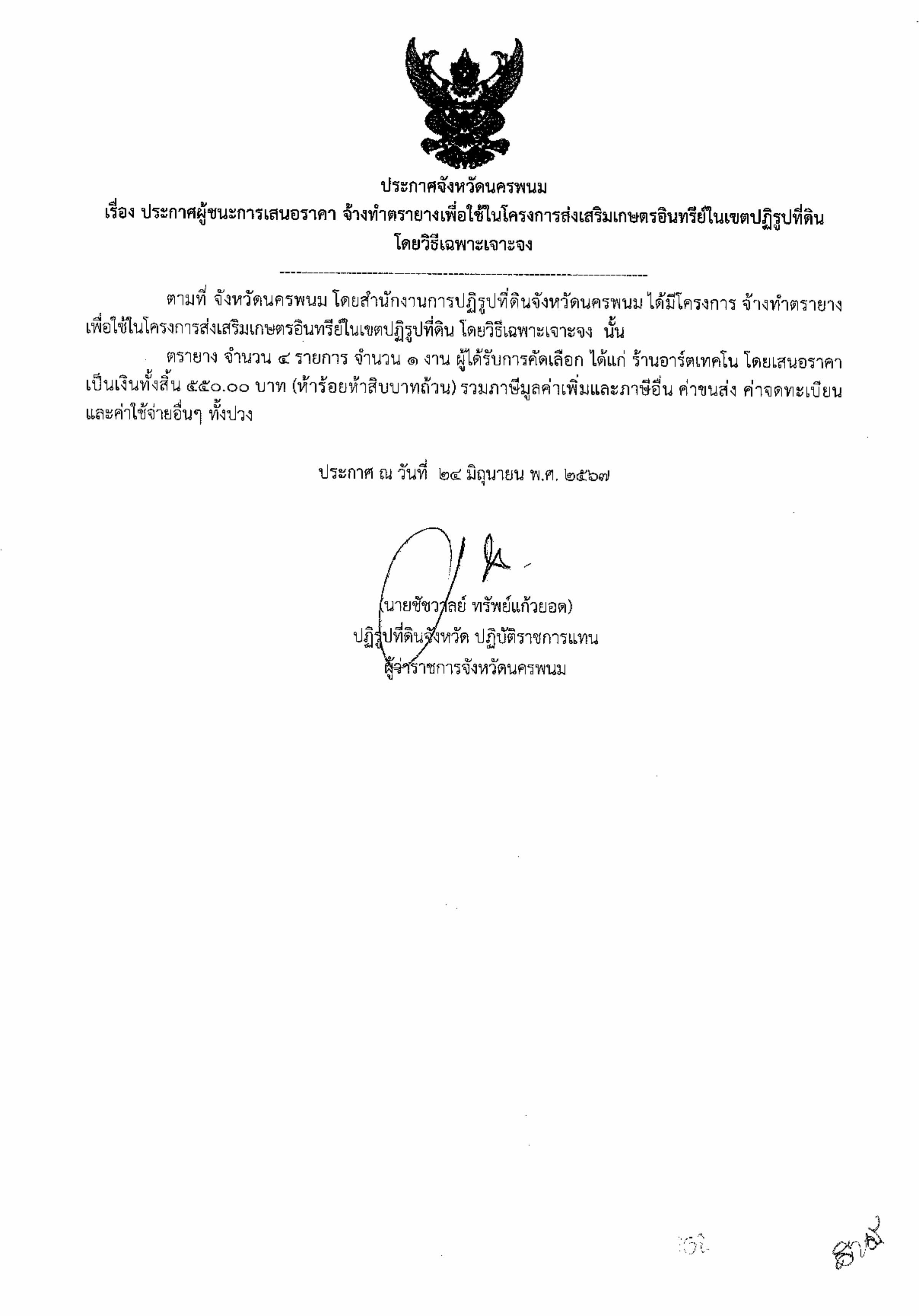 ประกาศผู้ชนะการเสนอราคาจ้างทำตรายางเพื่อใช้ในโครงการส่งเสริมเกษตรอินทรีย์ในเขตปฏิรูปที่ดิน