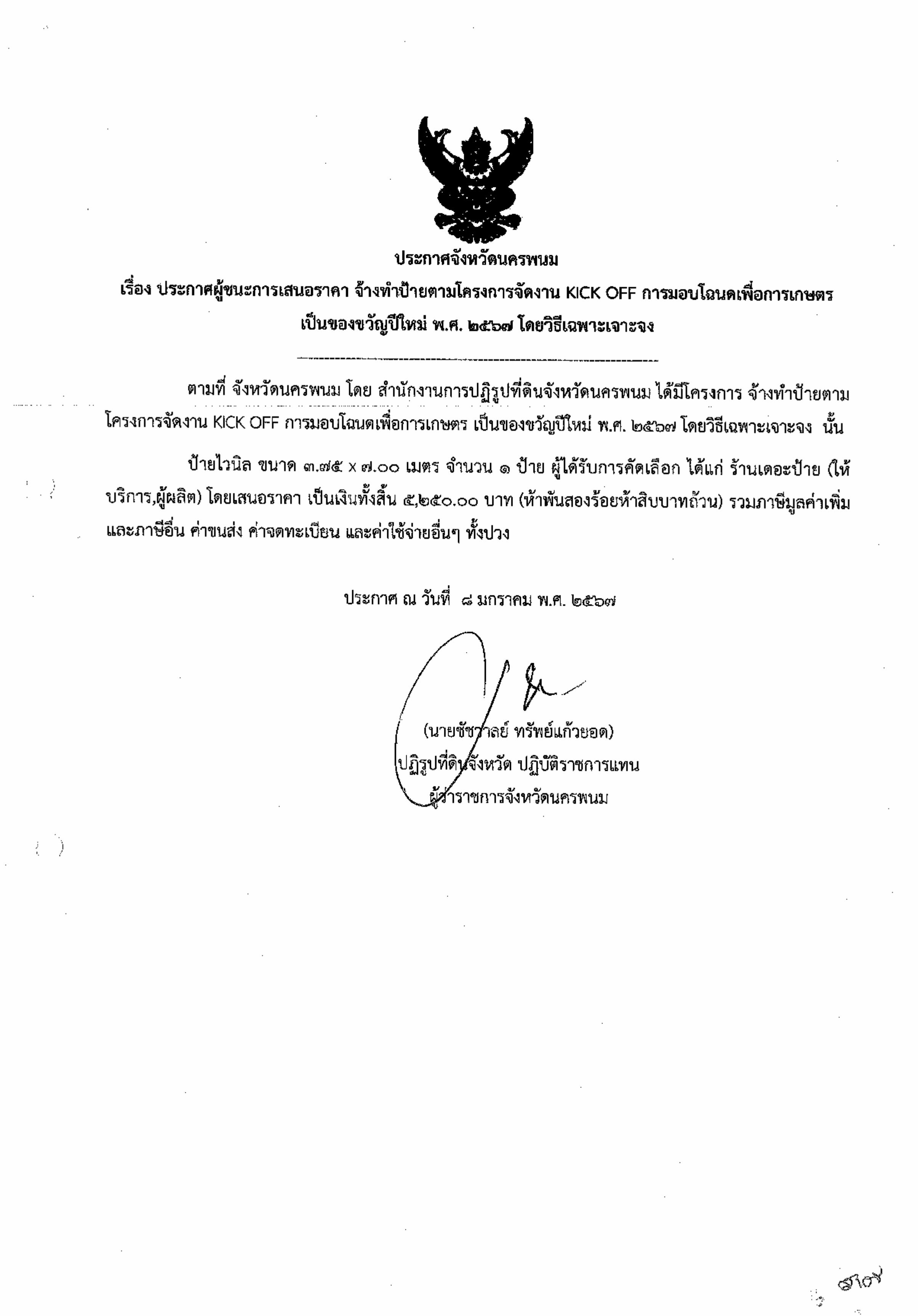 ประกาศผู้ชนะการเสนอราคาจ้างทำป้ายโครงการจัดงาน KICK OFF การมอบโฉนดเพื่อการเกษตรเป็นของขวัญปีใหม่
