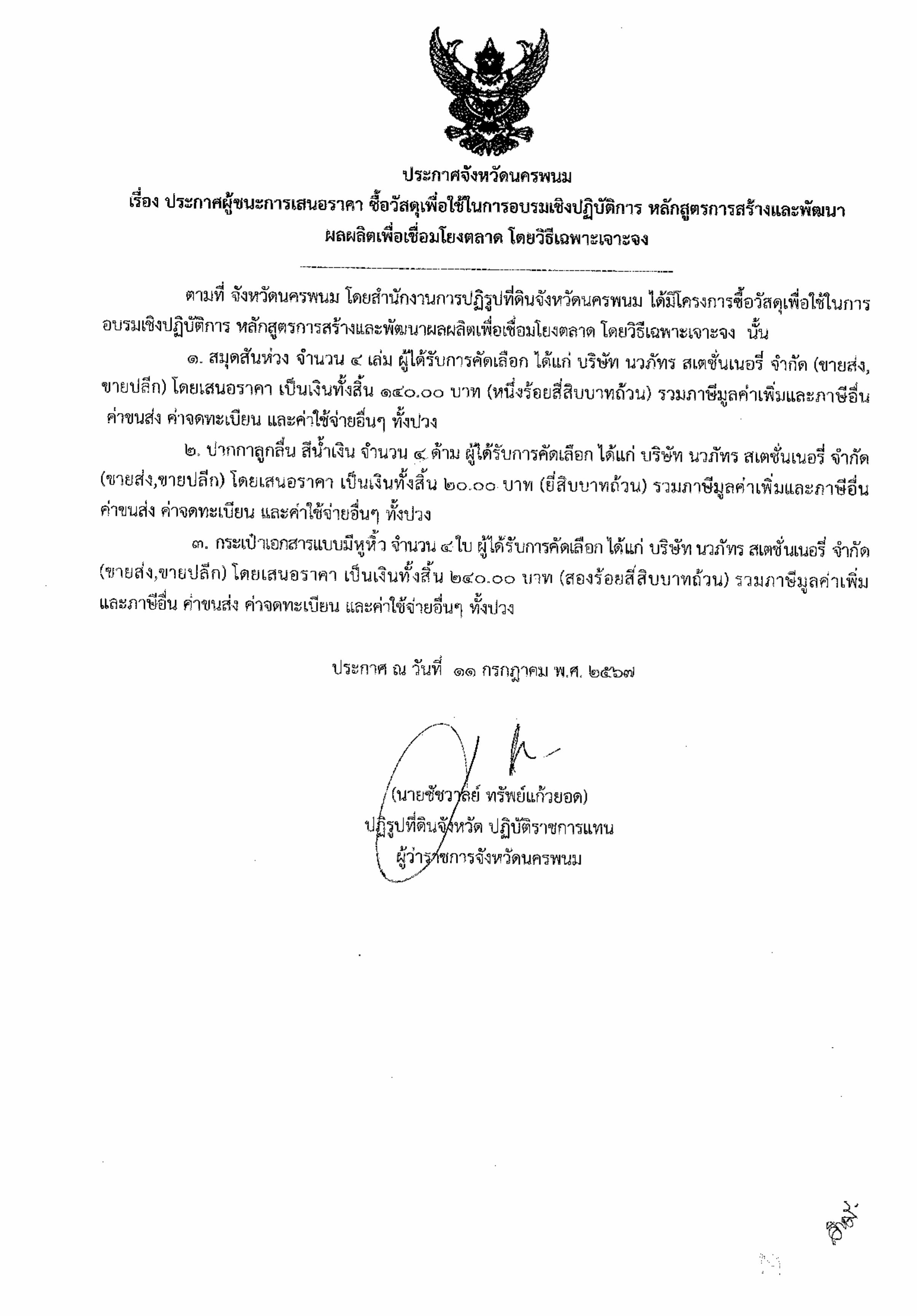 ประกาศผู้ชนะการเสนอราคาซื้อวัสดุเพื่อใช้ในการอบรมเชิงปฏิบัติการ หลักสูตรการสร้างและพัฒนาผลผลิตจเพื่อเชื่อมโยงตลาด