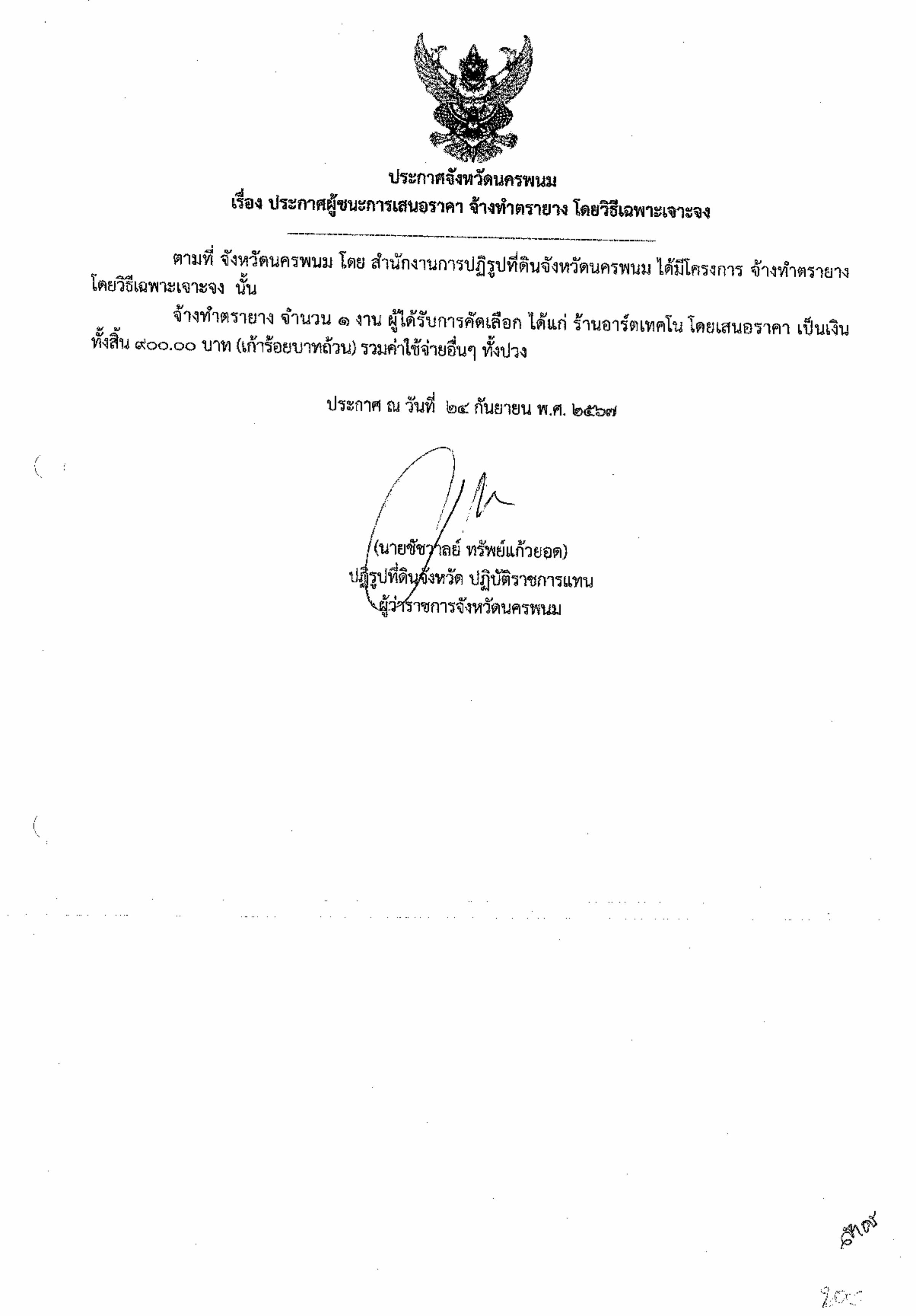ประกาศผู้ชนะการเสนอราคา จ้างทำตรายาง