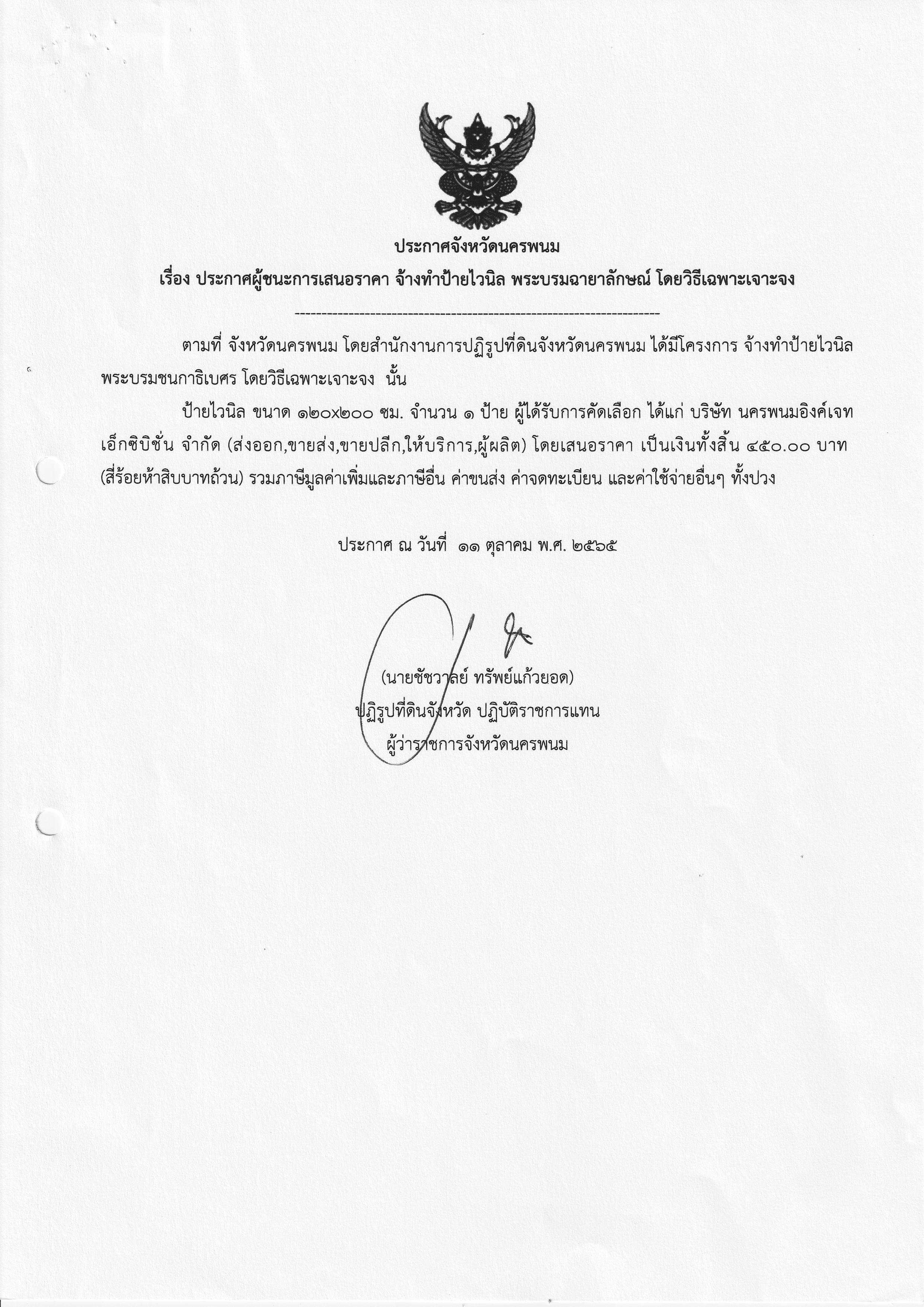 ประกาศผู้ชนะการเสนอราคา จ้างทำป้ายไวนิล พระบรมฉายาลักษณ์