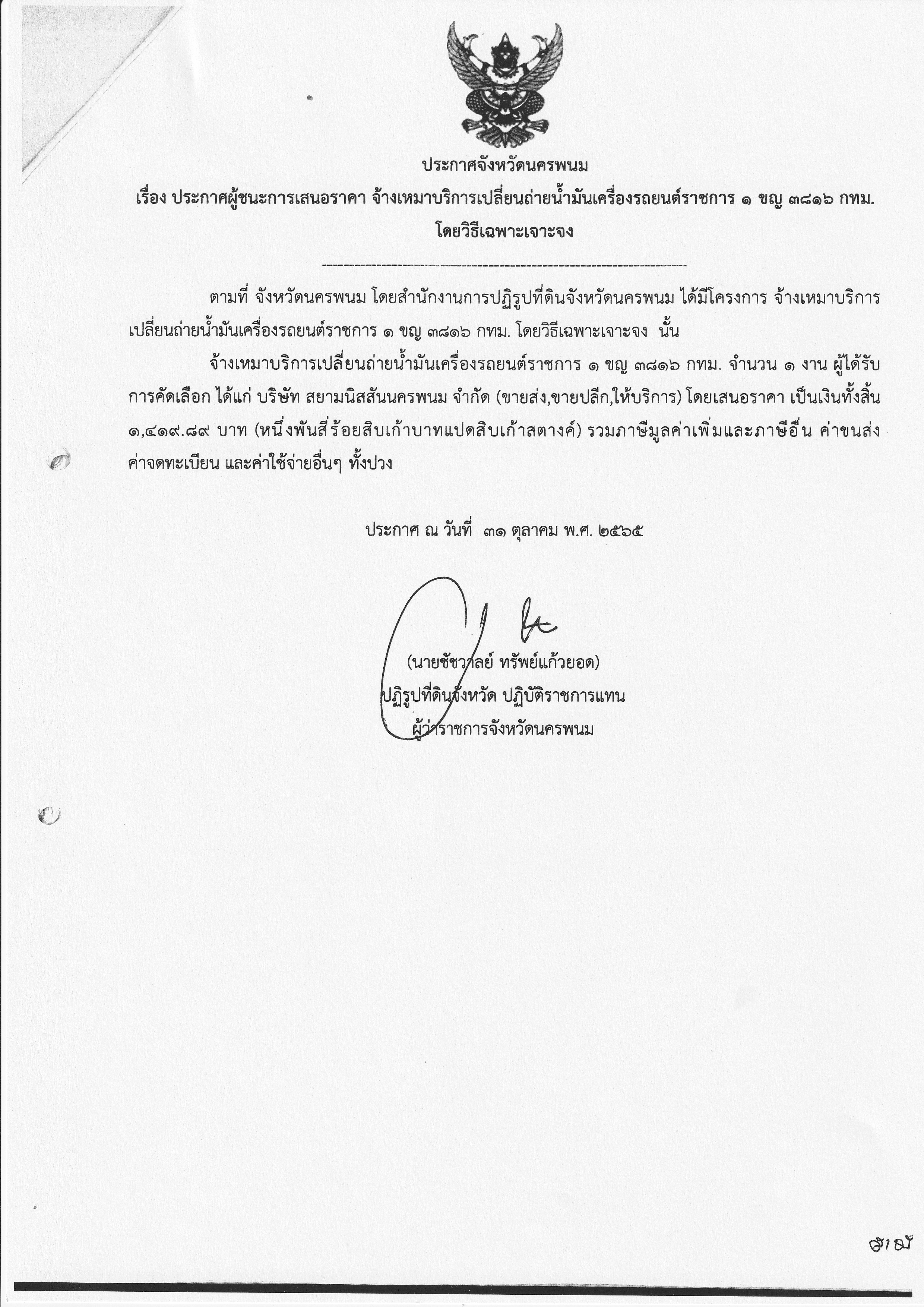 ประกาศผู้ชนะการเสนอราคา จ้างเหมาบริการเปลี่ยนถ่ายน้ำมันเครื่องรถยนต์ราชการ 1ขญ 3816 กรุงเทพมหานคร