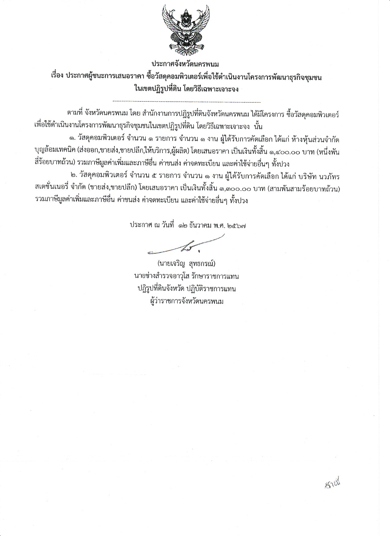 ประกาศผู้ชนะการเสนอราคา ซื้อวัสดุคอมพิวเตอร์เพื่อใช้ดำเนินงานโครงการพัฒนาธุรกิจชุมชน