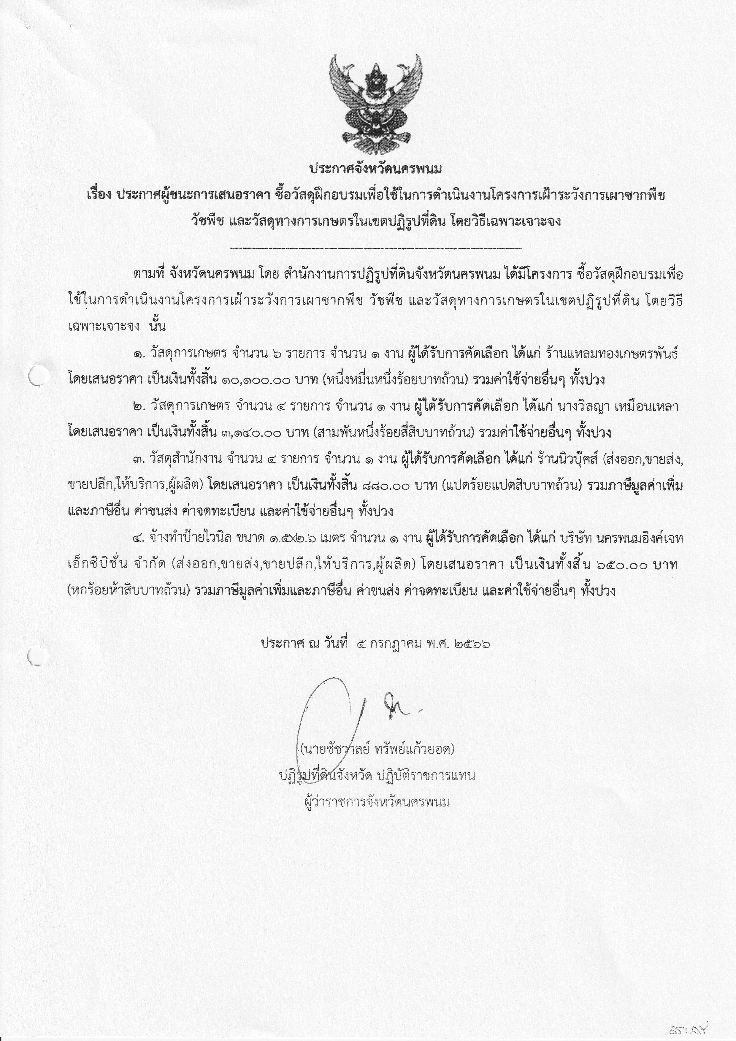 ประกาศผู้ชนะการเสนอราคา ซื้อวัสดุฝึกอบรมเพื่อใช้ในการดำเนินงานโครงการเฝ้าระวังการเผาซากพืช วัชพืช และวัสดุทางการเกษตรในเขตปฏิรูปที่ดิน