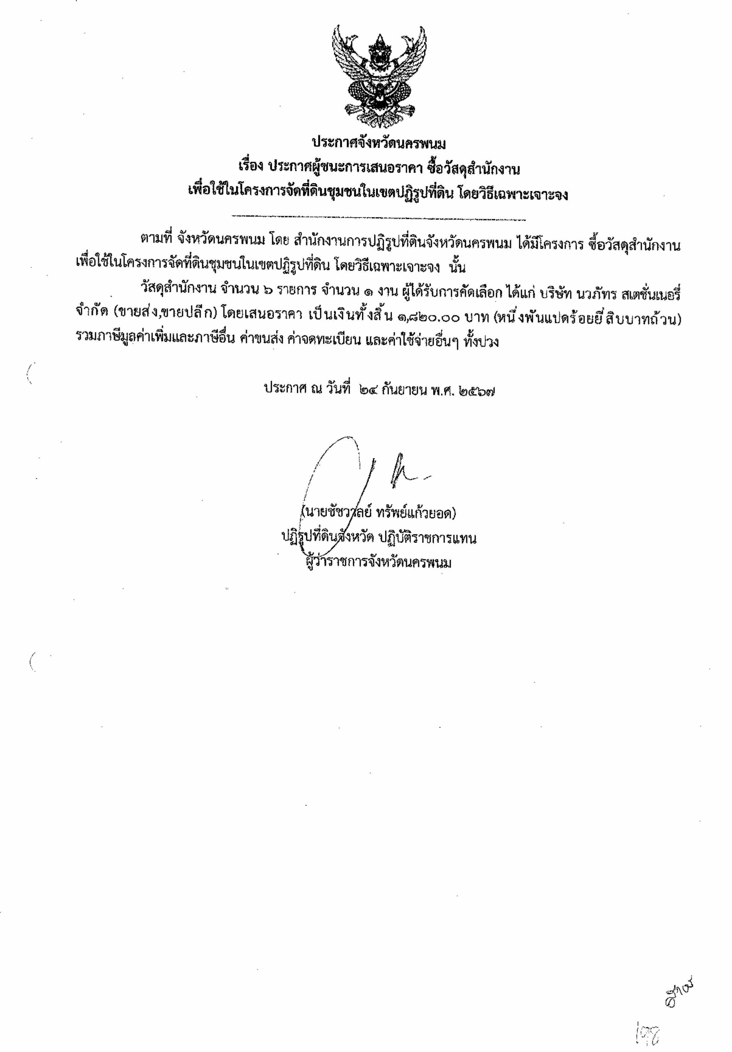 ประกาศผู้ชนะการเสนอราคา ซื้อวัสดุสำนักงานเพื่อใช้ในโครงการจัดที่ดินชุมชนในเขตปฏิรูปที่ดิน