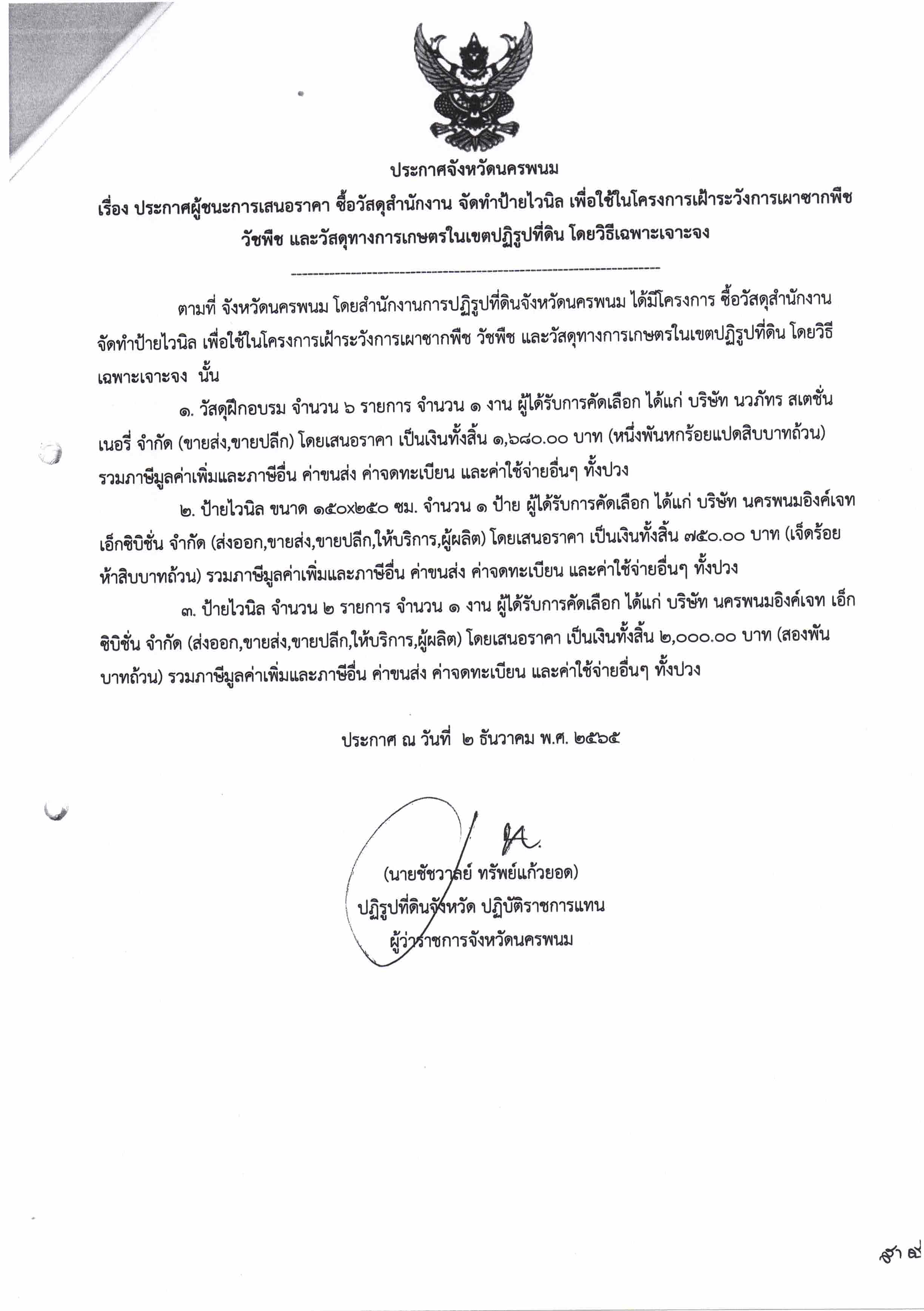 ประกาศผู้ชนะการเสนอราคา ซื้อวัสดุสำนักงาน จัดทำป้ายไวนิล เพื่อใช้ในโครงการเฝ้าระวังการเผาซากพืช วัชพืช และวัสดุทางการเกษตรในเขตปฏิรูปที่ดิน
