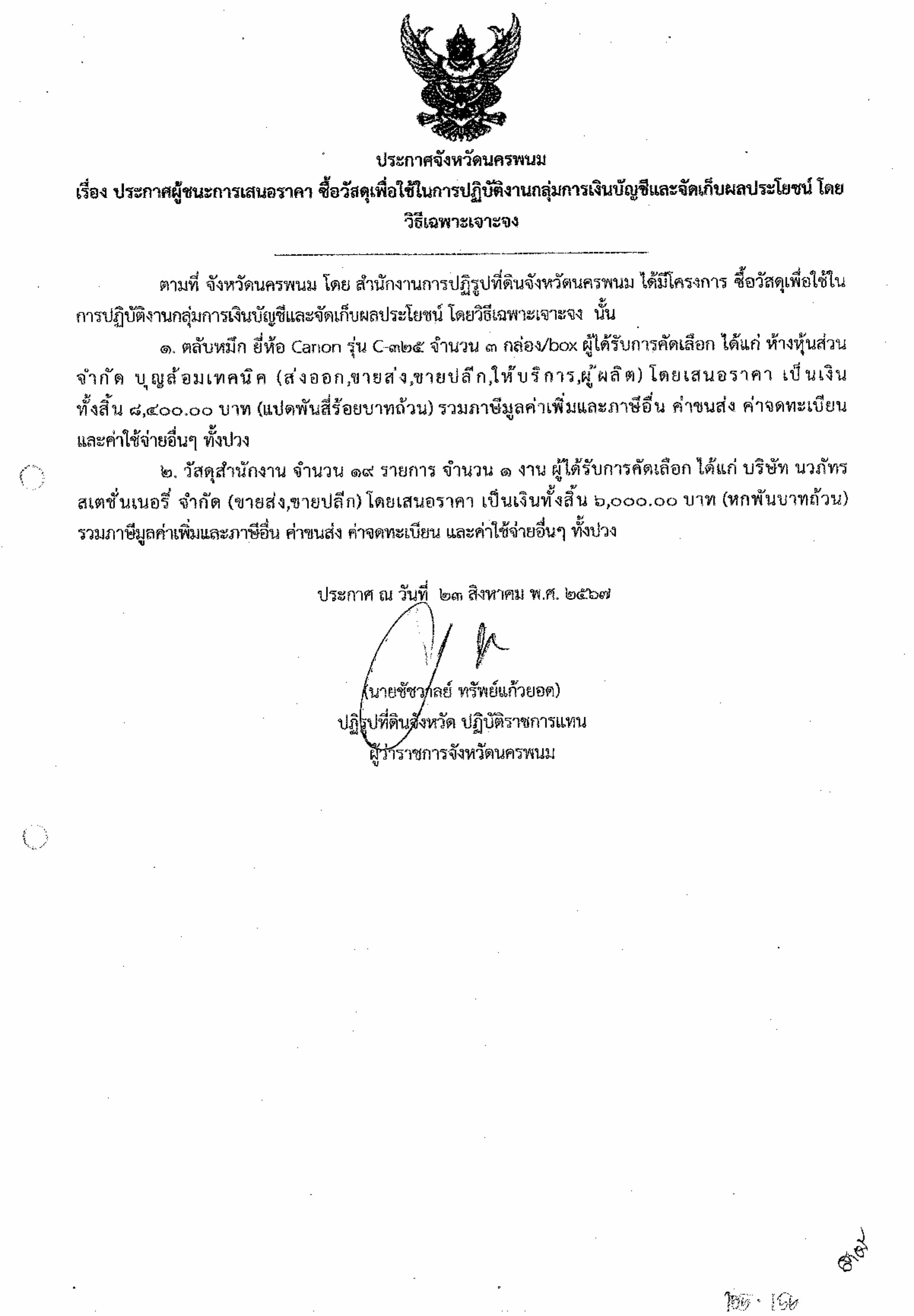 ประกาศผู้ชนะการเสนอราคา ซื้อวัสดุเพื่อใช้ปฏิบัติงานกลุ่มการเงินบัญชีและจัดเก็บผลประโยชน์