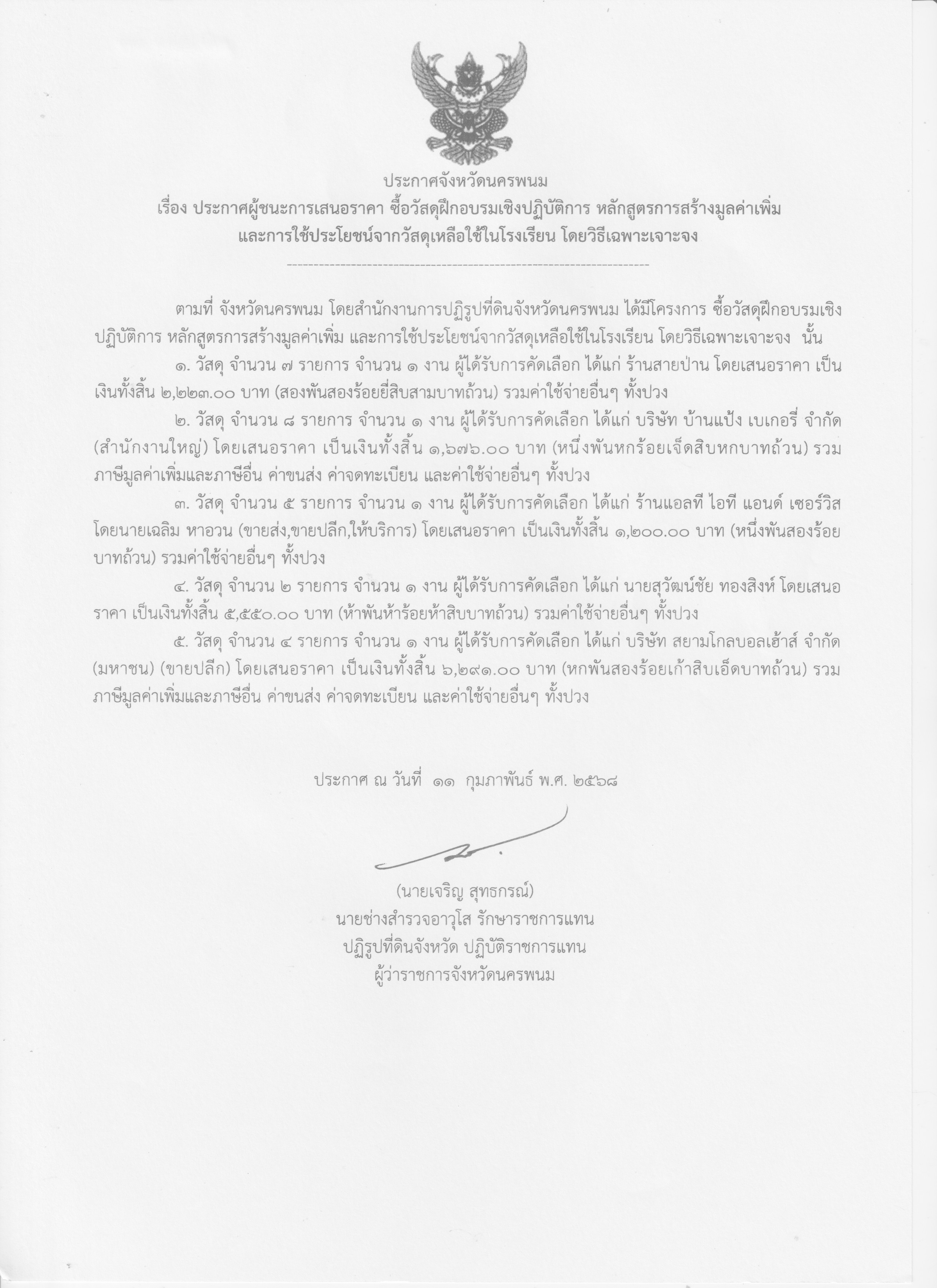ประกาศผู้ชนะการเสนอราคา ซื้อวัสดุฝึกอบรมเชิงปฏิบัติการ หลักสูตรการสร้างมูลค่าเพิ่มและการใช้ประโยชน์จากวัสดุเหลือใช้ในโรงเรียน โดยวิธีเฉพาะเจาะจง