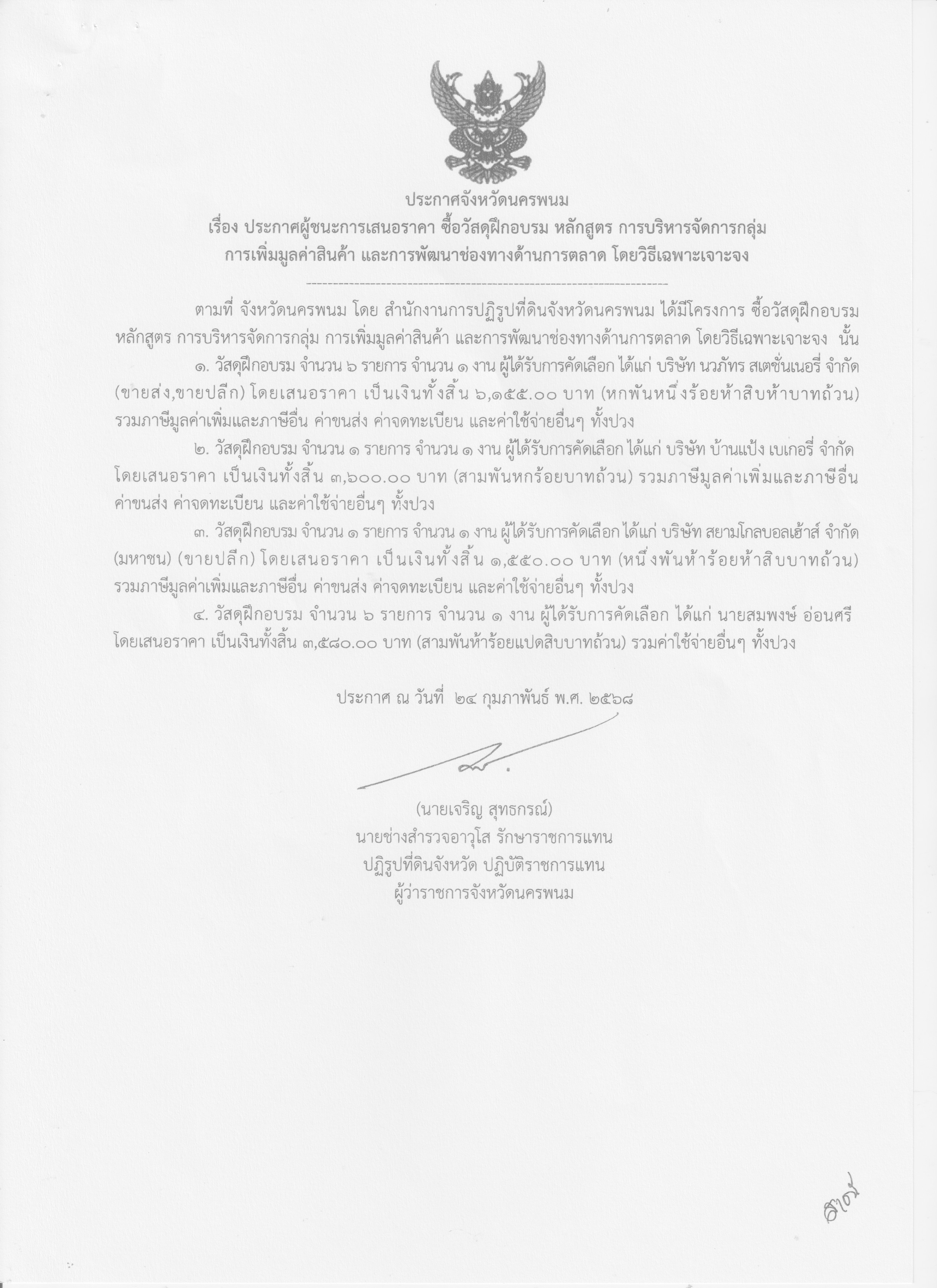 ประกาศผู้ชนะการเสนอราคา ซื้อวัสดุฝึกอบรม หลักสูตร การบริหารจัดการกลุ่มการเพิ่มมูลค่าสินค้า และการพัฒนาช่องทางด้านการตลาด โดยเฉพาะเจาะจง