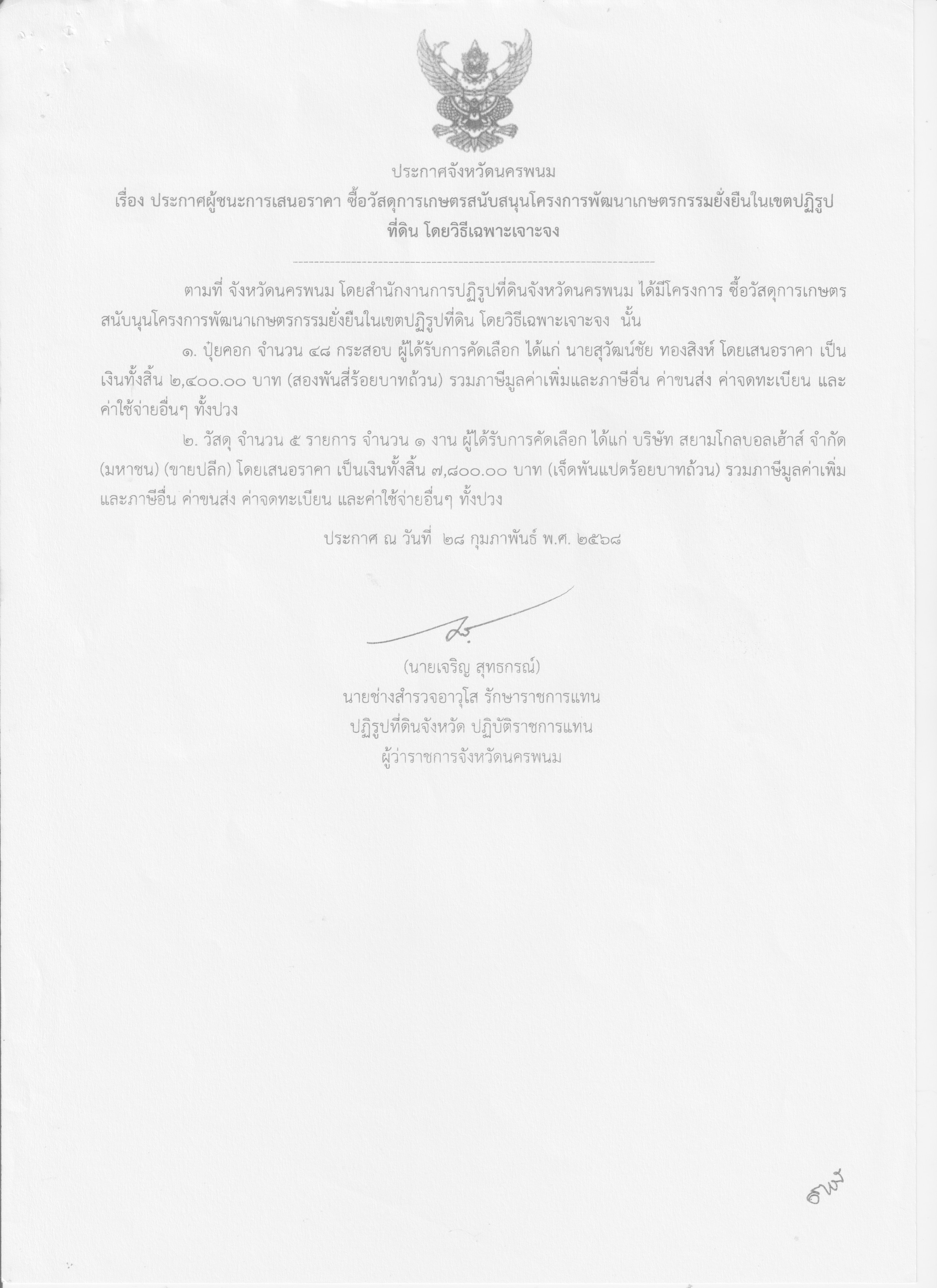 ประกาศผู้ชนะการเสนอราคา ซื้อวัสดุฝึกอบรมเชิงปฏิบัติการ หลักสูตร การสร้างและพัฒนาผู้นำในการขยายผลการทำเกษตรกรรมยั่งยืนในเขตปฏิรูปที่ดิน (เกษตรกรขั้น 2) โดยเฉพาะเจาะจง