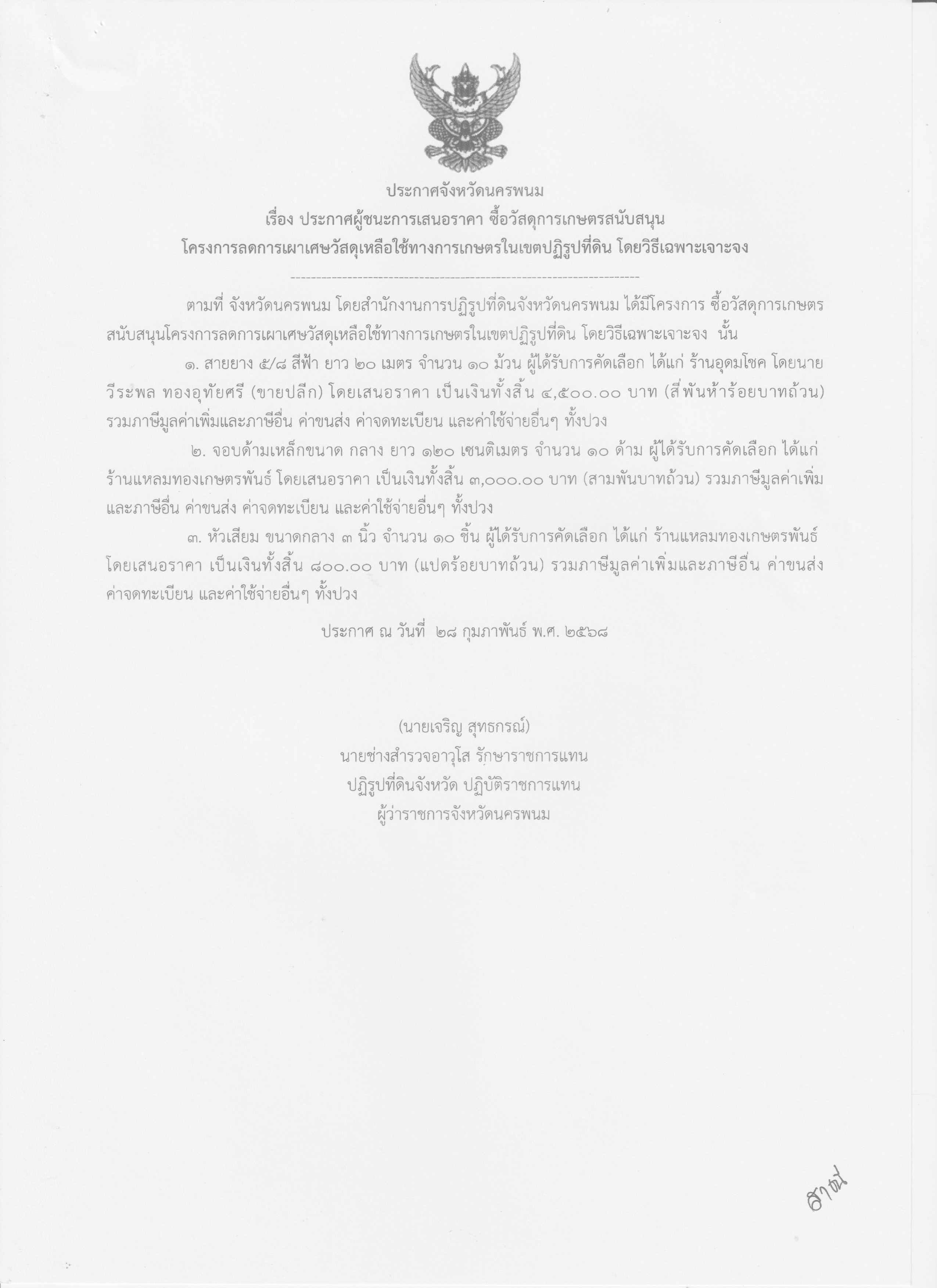 ประกาศผู้ชนะการเสนอราคา ซื้อวัสดุการเกษตรสนับสนุนโครงการลดการเผาเศษวัสดุเหลือใช้ทางการเกษตรในเขตปฏิรูปที่ดิน โดนเฉพาะเจาะจง