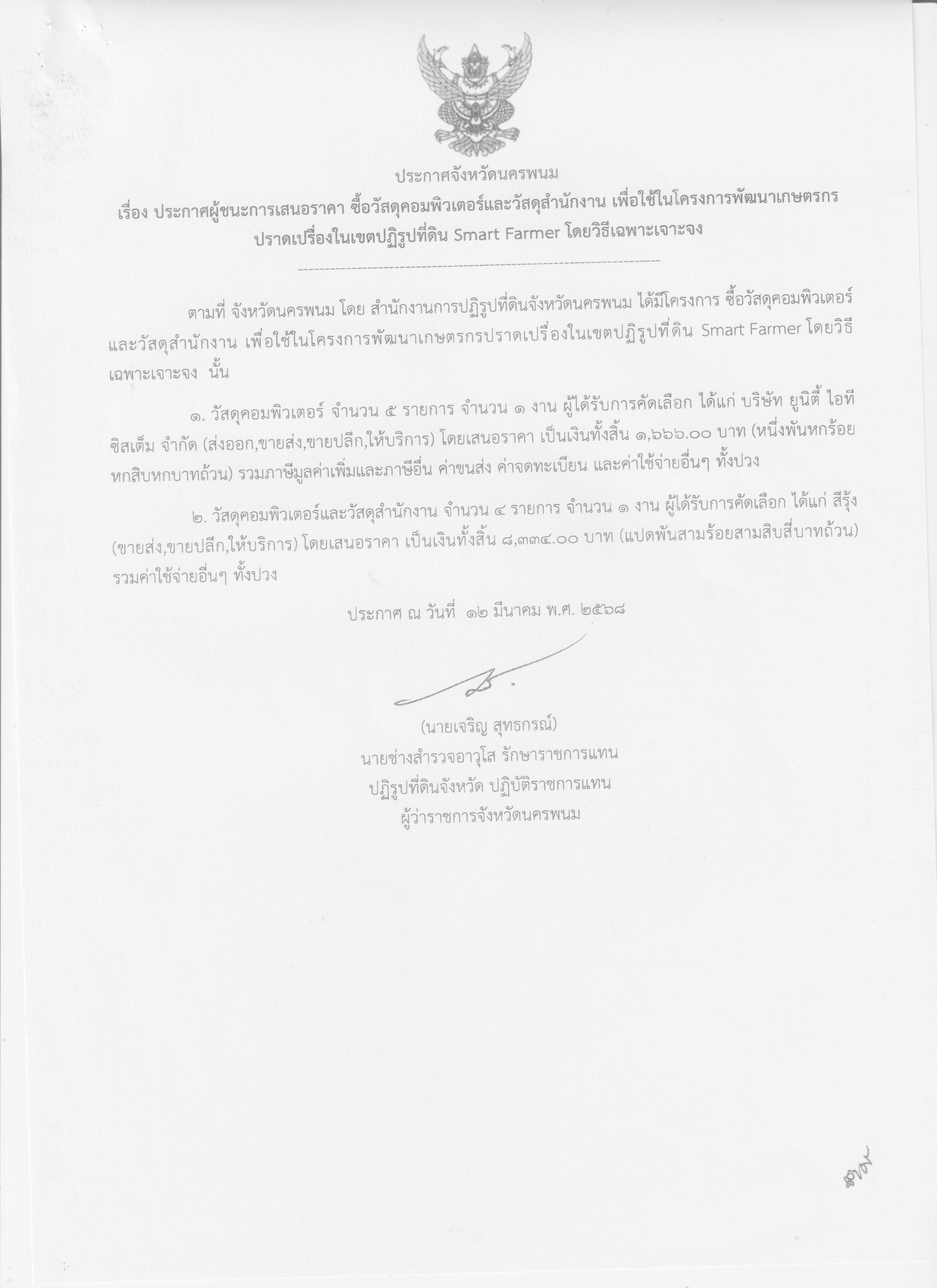 ประกาศผู้ชนะการเสนอราคา ซื้อวัสดุคอมพิวเตอร์และวัสดุสำนักงาน เพื่อใช้ในโครงการพัฒนาเกษตรกรปราดเปรื่องในเขตปฏิรูปที่ดิน Smart Farmer โดยเฉพาะเจาะจง