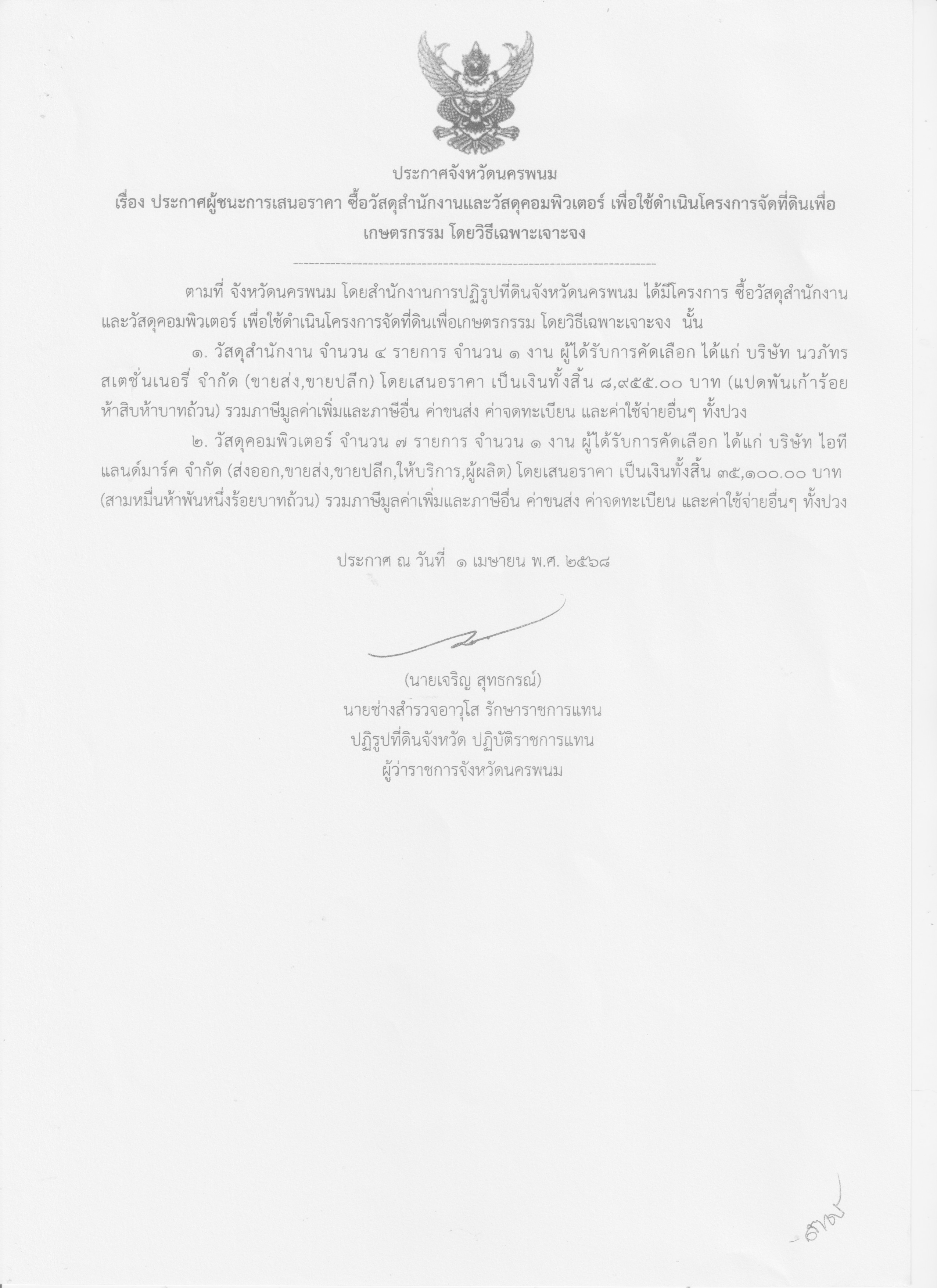 ประกาศผู้ชนะการเสนอราคา ซื้อวัสดุสำนักงานและวัสดุคอมพิวเตอร์ เพื่อใช้ดำเนินโครงการจัดที่ดินเพื่อเกษตรกรรม โดยวิธีเฉพาะเจาะจง
