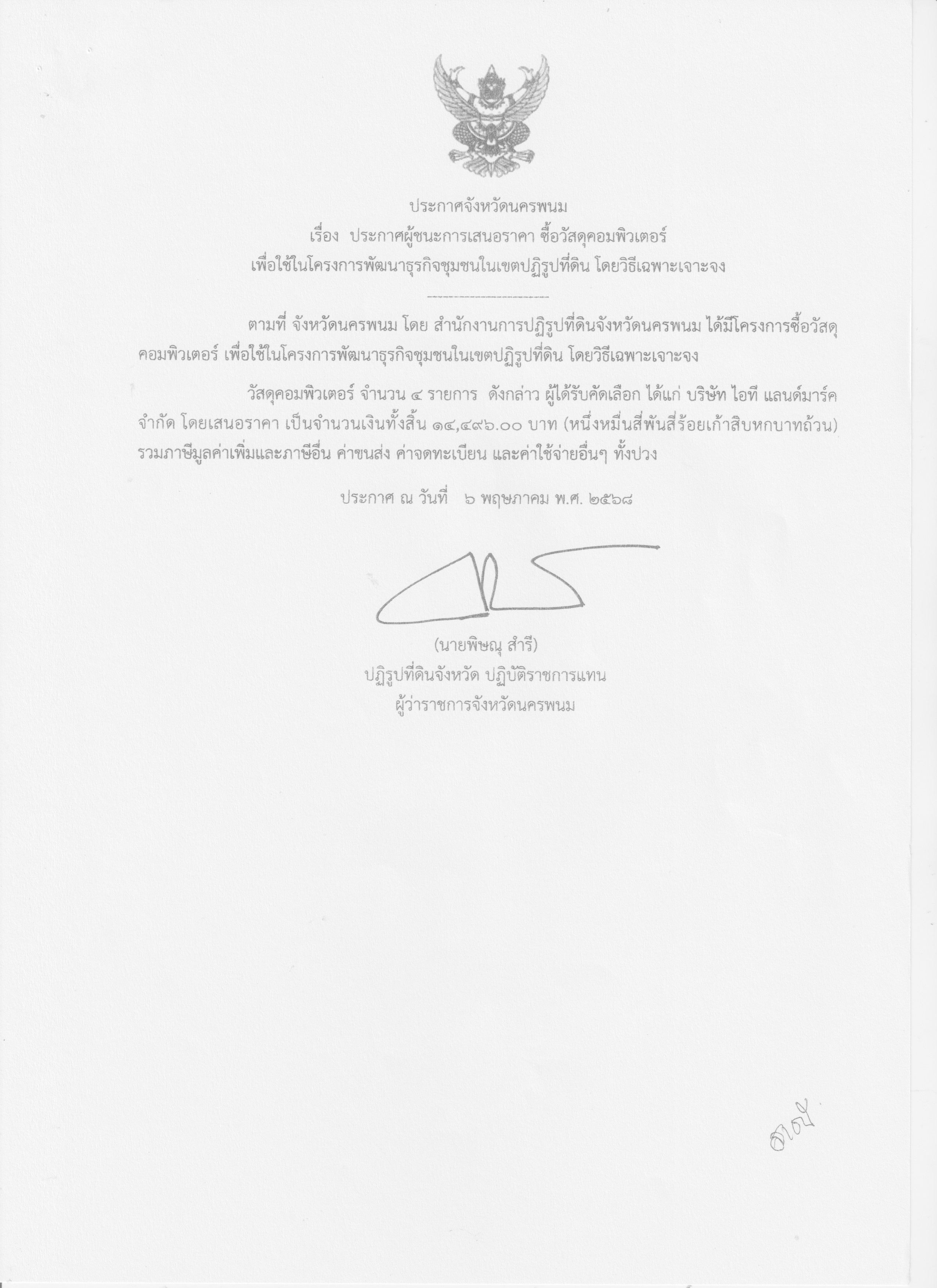 ประกาศผู้ชนะการเสนอราคา ซื้อวัสดุคอมพิวเตอร์ เพื่อใช้ในโครงการพัฒนาธุรกิจชุมชนในเขตปฏิรูปที่ดิน โดยวิธีเฉพาะเจาะจง