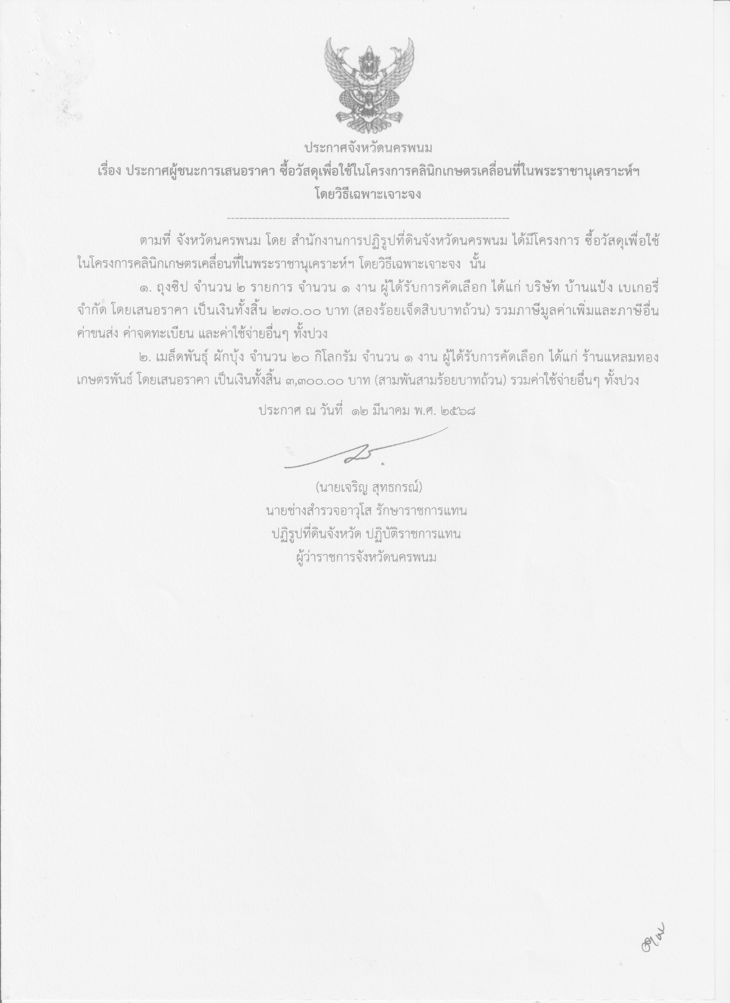 ประกาศผู้ชนะการเสนอราคา ซื้อวัสดุเพื่อใช้ในโครงการคลินิกเกษตรเครลื่อนที่ในพระราชานุเคราห์ฯ โดยวิธีเฉพาะเจาะจง