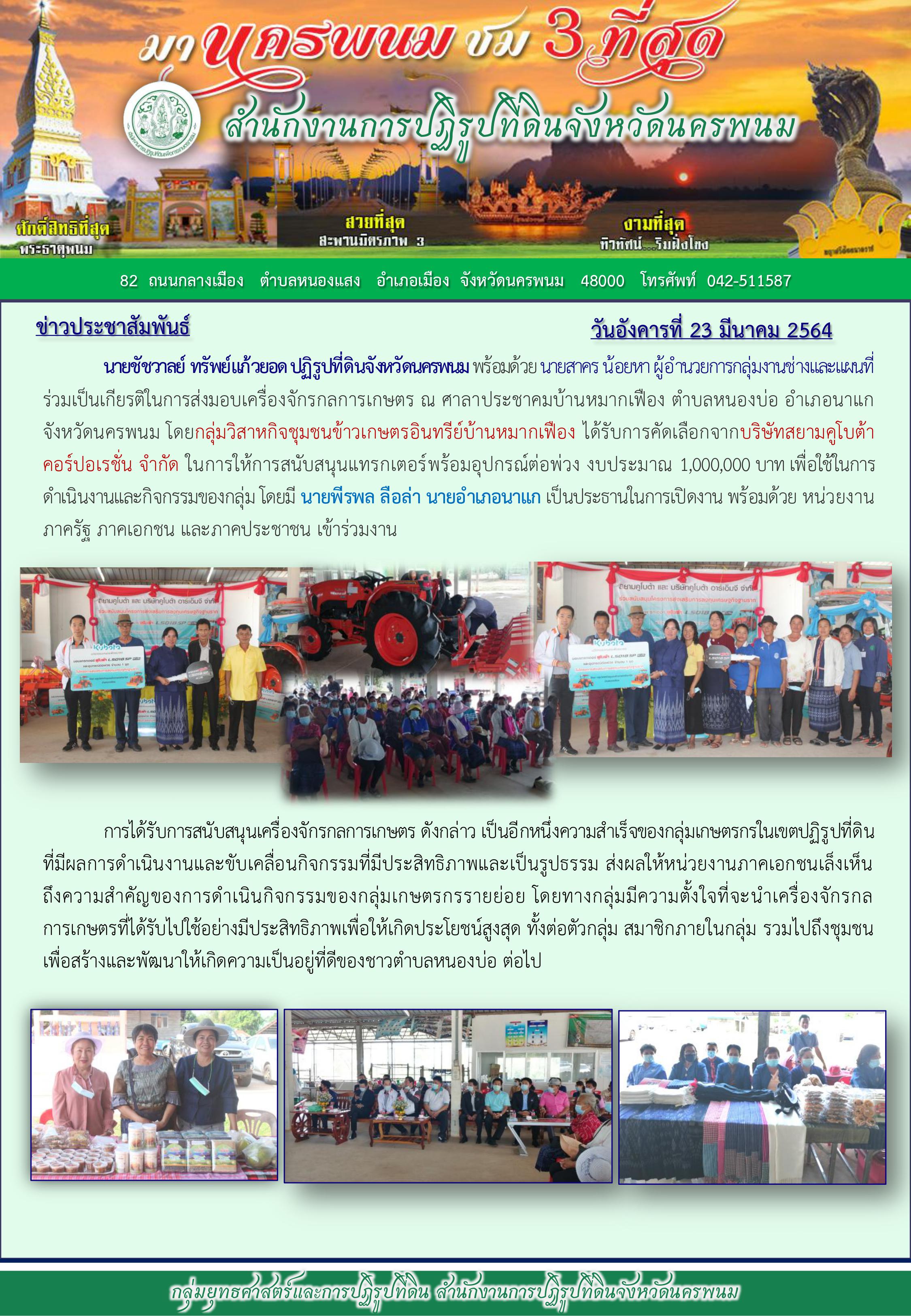 ส.ป.ก.นครพนม เข้าร่วมเป็นเกียรติในการส่งมอบเครื่องจักรกลการเกษตร