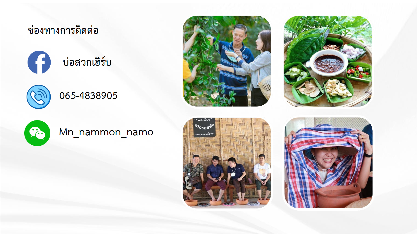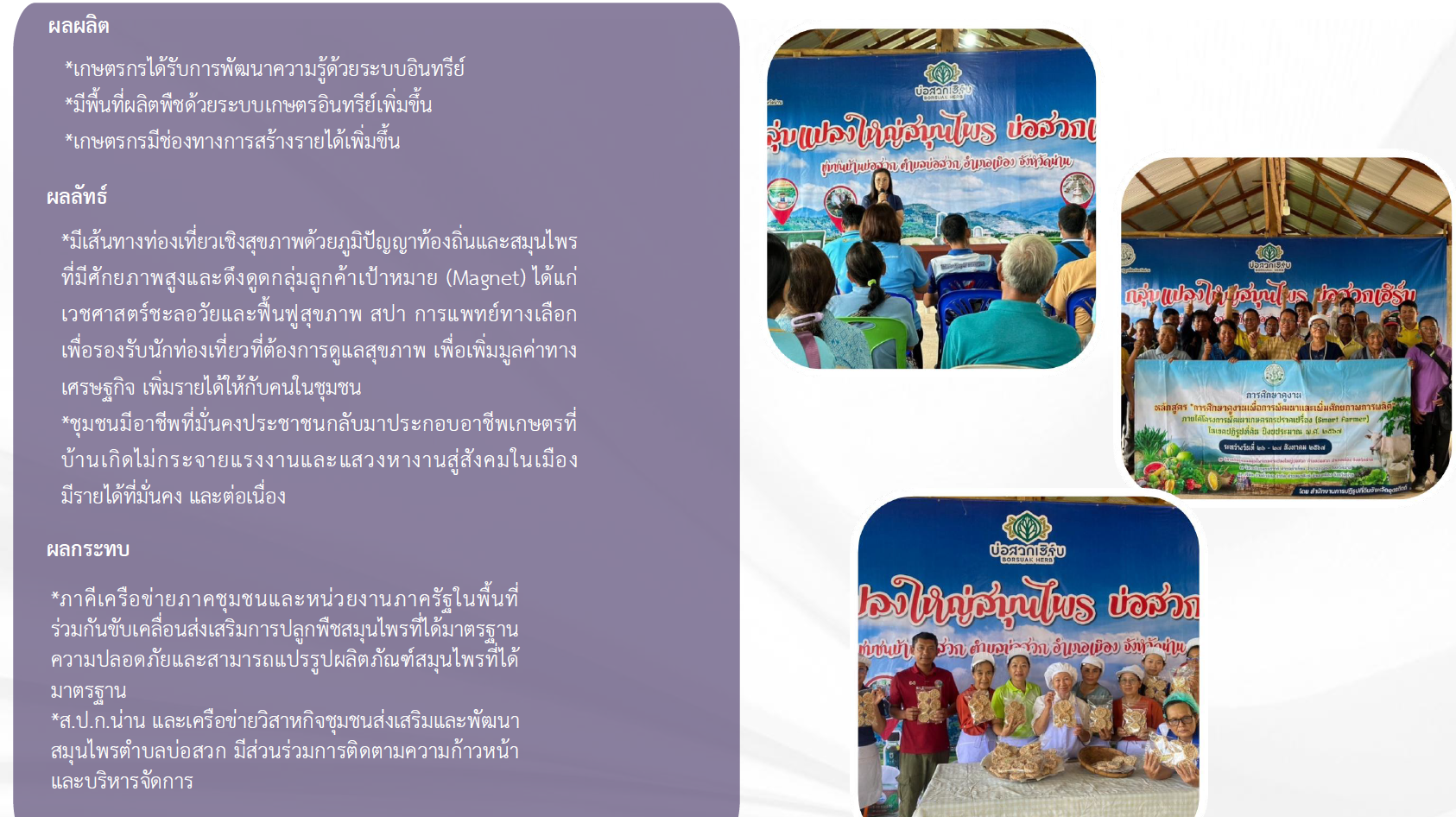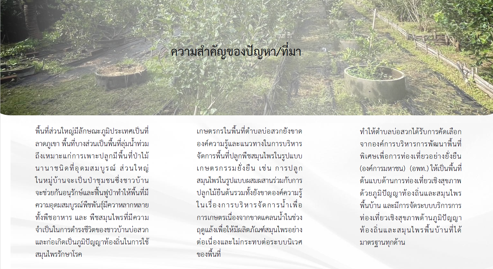 ชื่อผลงาน "อัตลักษณ์สมุนไพรชุมชนบ่อสวก สู่การท่องเที่ยวเชิงสุขภาพที่ยั่งยืน'