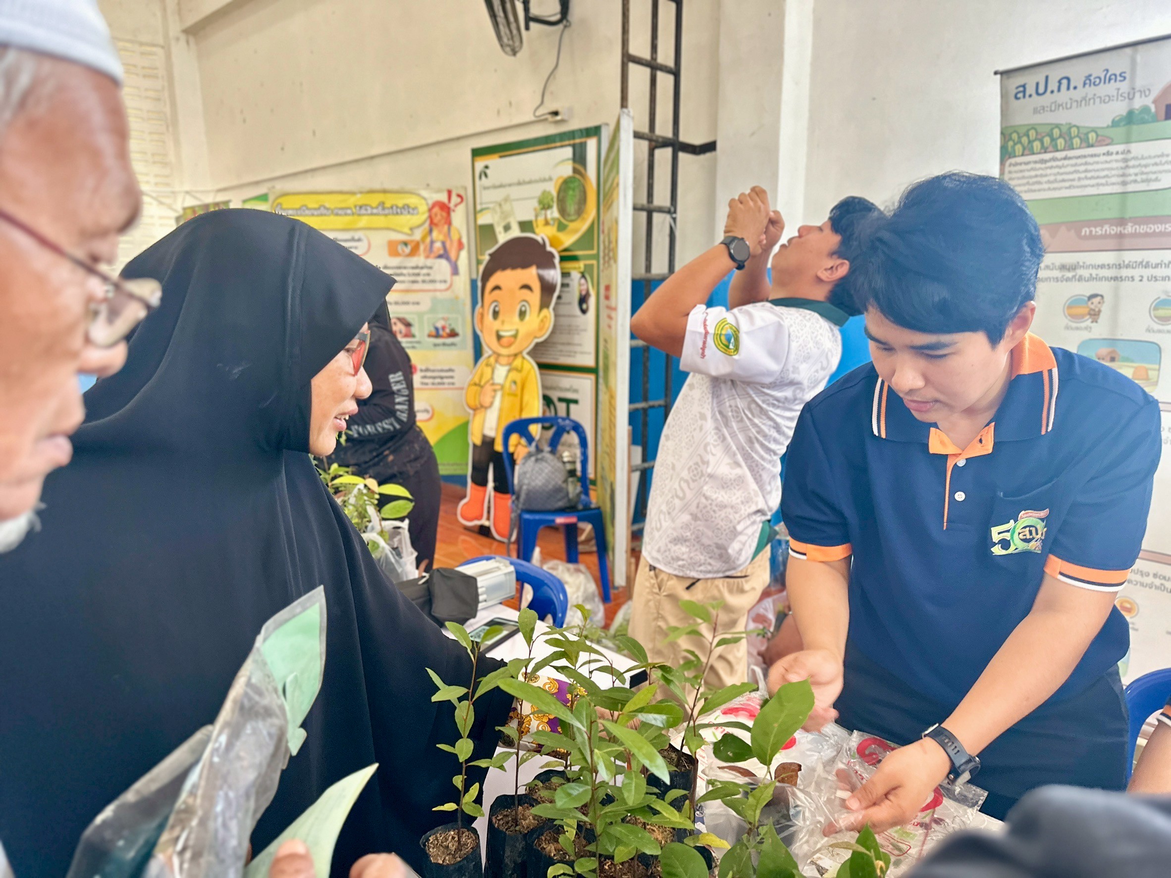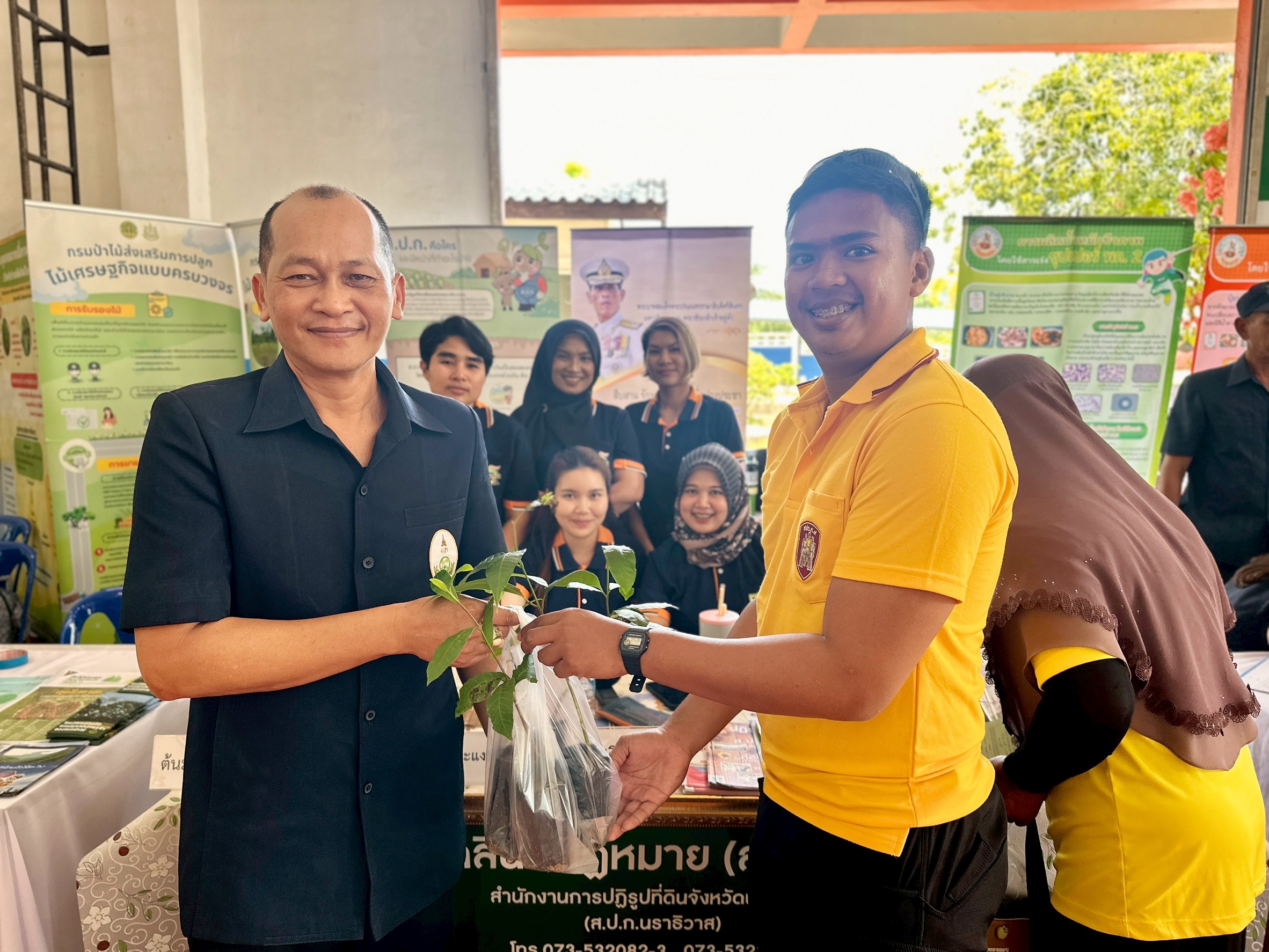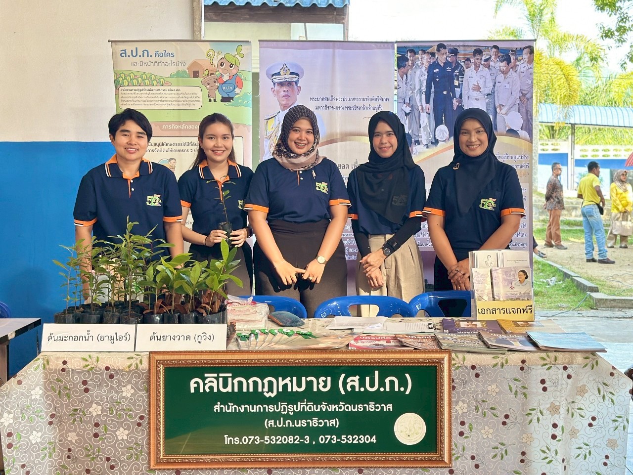 พร้อมนี้ได้มอบหมายให้ นางก้อติม๊ะ จันทร์หอม เจ้าหน้าที่ปฏิรูปที่ดิน พร้อมด้วยเจ้าหน้าที่ ส.ป.ก.นราธิวาส ร่วมจัดนิทรรศการ ออกหน่วยบริการ พร้อมทั้งให้ความรู้เกี่ยวกับกฎหมาย ส.ป.ก. กฎหมายทั่วไป และมอบโฉนดเพื่อการเกษตร จำนวน 10 ราย 10 แปลง เนื้อที่ 39-0-56 ไร่ มอบเอกสารเผยแพร่ มอบพันธุ์กล้าไม้ ต้นมะกอกน้ำ ต้นยางวาด ต้นพะยอม ต้นตะเคียนทอง ต้นมะม่วง ต้นมะม่วงหิมพานต์ จำนวน 500 ต้น ให้เกษตรกรที่มาใช้บริการ จำนวน 180 ราย