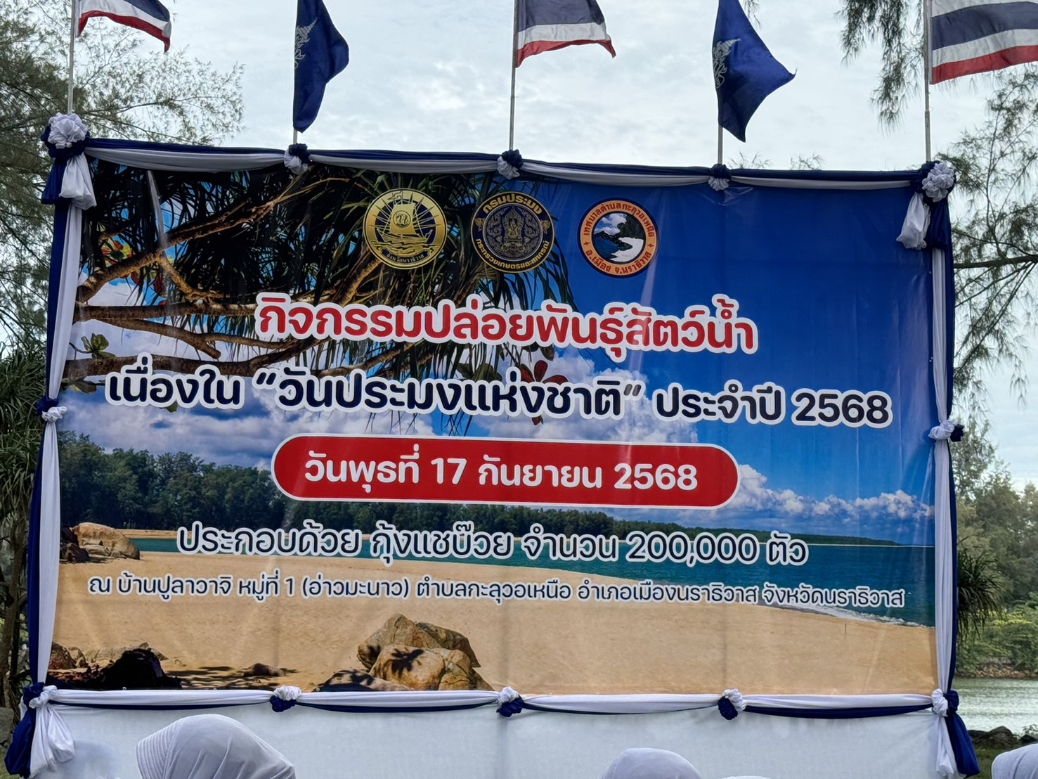 วันพุธที่ 17 กันยายน 2568 นายประเสริฐ กองสง ปฏิรูปที่ดินจังหวัดนราธิวาส มอบหมายให้ นายปราโมทย์ จิตต์สกูล ผู้อำนวยการกลุ่มยุทธศาสตร์และการปฏิรูปที่ดิน พร้อมด้วยเจ้าหน้าที่ ส.ป.ก.นราธิวาส เข้าร่วมพิธีปล่อยพันธุ์สัตว์น้ำ เนื่องในวันประมงแห่งชาติ ประจำปี 2568 โดยมีนายมานพ หนูสอน รองอธิบดีกรมประมง เป็นประธาน พร้อมด้วยนายเรวัตร คงประดิษฐ์ ประมงจังหวัดนราธิวาส รองนายกเทศมนตรีตำบลกะลุวอเหนือ หัวหน้า/เจ้าหน้าที่ส่วนราชการสังกัดกระทรวงเกษตรและสหกรณ์ และประชาชนในพื้นที่ร่วมปล่อยพันธุ์สัตว์น้ำ พร้อมทั้งมอบป้ายโครงการกว้านลากเรือประมงพื้นบ้านให้แก่กลุ่มรักษ์ทะเลสะปอม และมอบเครื่องมือทำการประมง (อวนจมกุ้ง) แก่ตัวแทนชาวประมงในพื้นที่ ณ บ้านปูลาวาจิ หมู่ที่ 1 ตำบลกะลุวอเหนือ อำเภอเมืองนราธิวาส จังหวัดนราธิวาส เพื่อเป็นการรณรงค์ให้ประชาชน ตระหนักถึงคุณค่าของทรัพยากรสัตว์น้ำ ตลอดจนมีส่วนร่วมในการอนุรักษ์และฟื้นฟูทรัพยากรสัตว์น้ำให้สามารถใช้ประโยชน์ได้อย่างยั่งยืน ซึ่งได้รับการสนับสนุนพันธุ์ สัตว์น้ำจากศูนย์วิจัยและพัฒนาประมงทะเลนราธิวาส โดยเป็นพันธุ์กุ้งแชบ๊วย จำนวน 200,000 ตัว