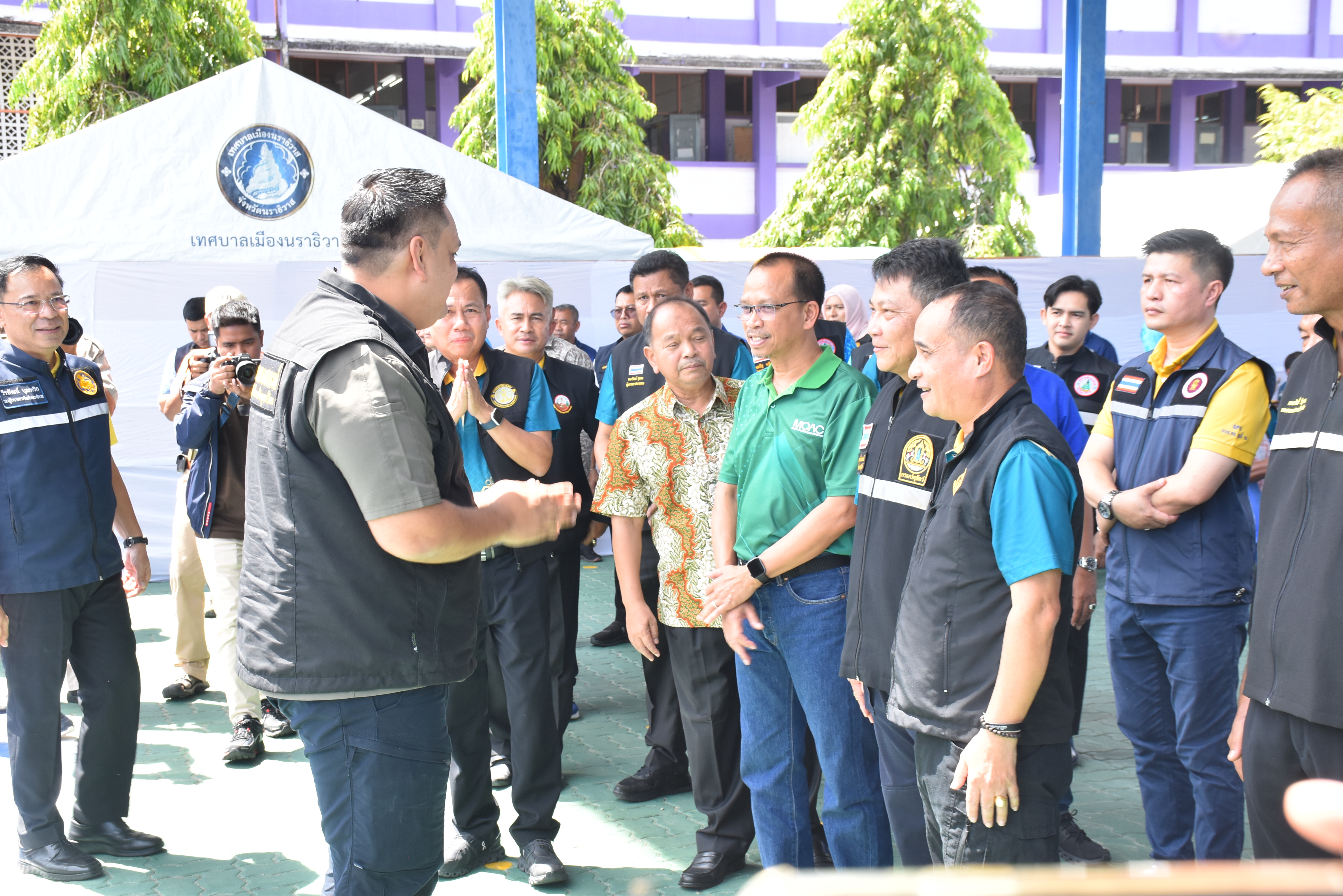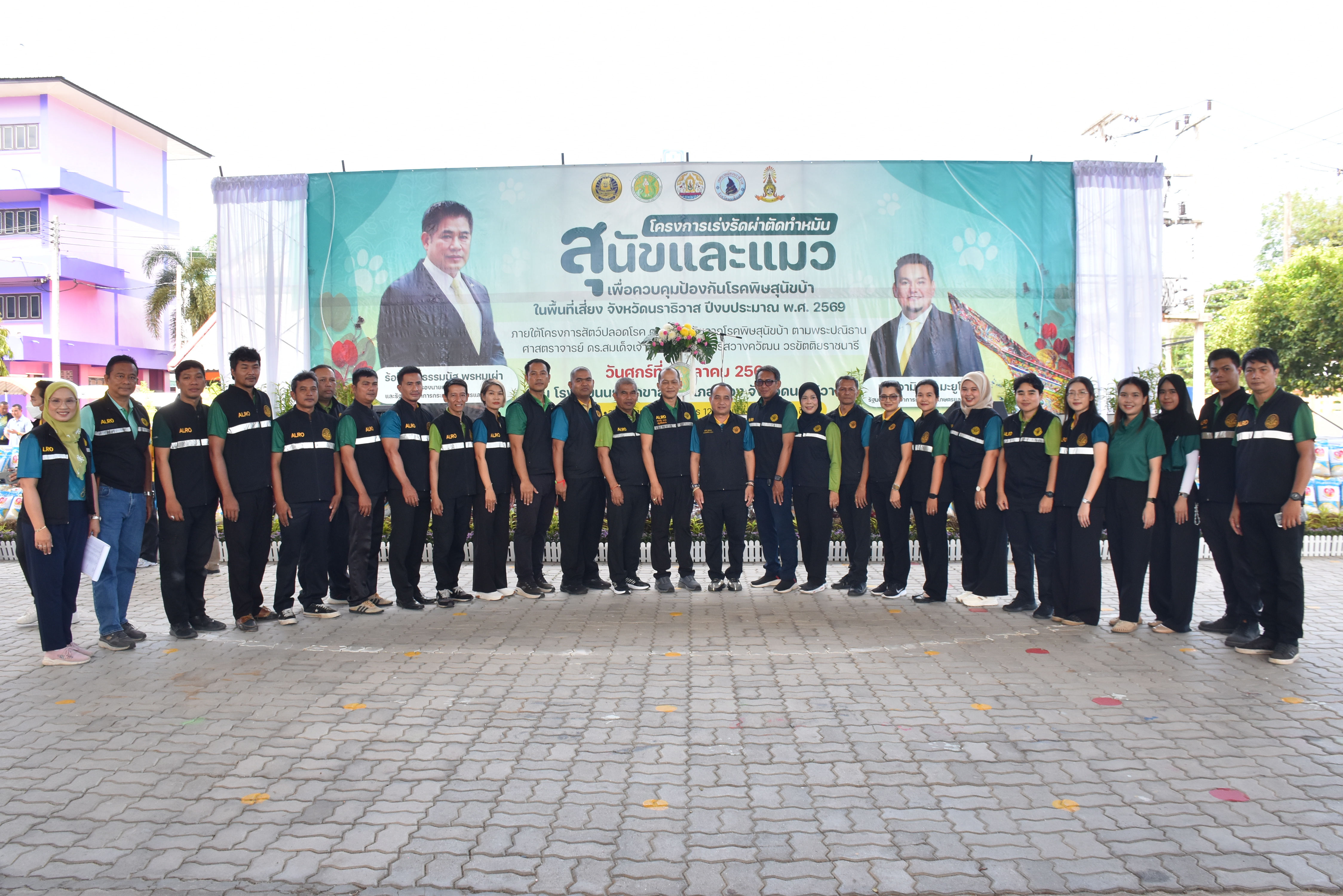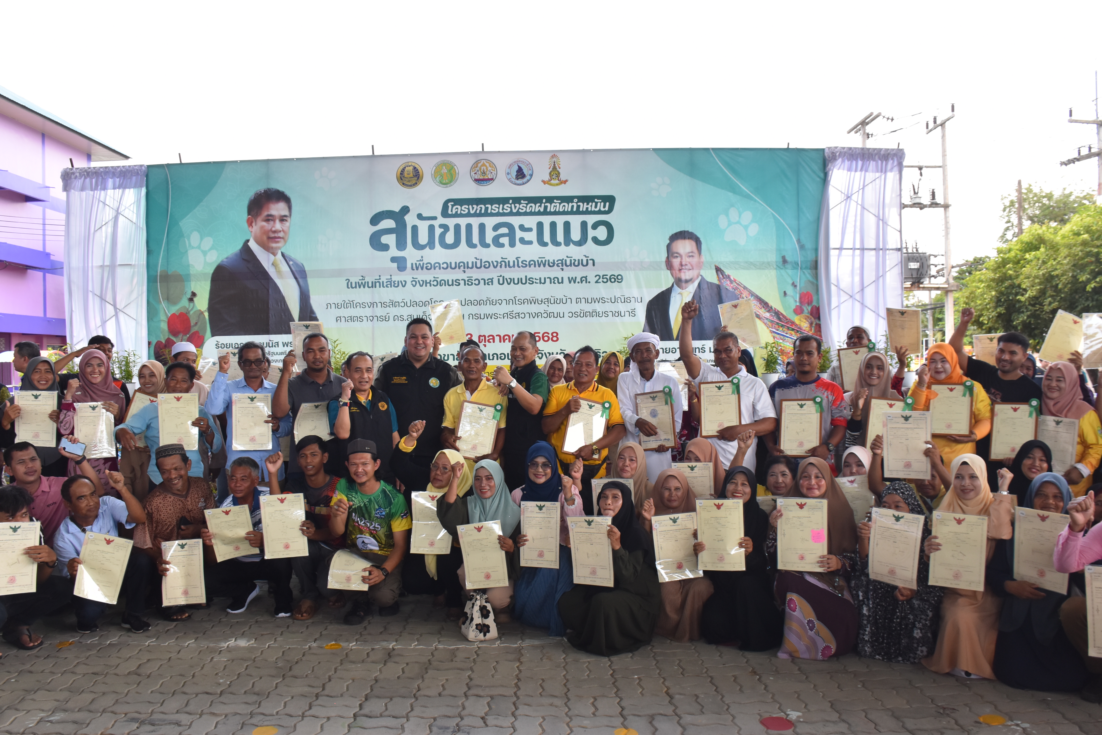 นราธิวาส - วันที่ 3 ตุลาคม 2568 นายสุรชัย ยุทธชนะ รองเลขาธิการ ส.ป.ก. พร้อมด้วย นายเกียรติยศ ทรงสง่า ผู้อำนวยการสำนักวิชาการและแผนงาน นายประเสริฐ กองสงปฏิรูปที่ดินนราธิวาส และปฏิรูปที่ดินจังหวัดยะลา และสงขลา ร่วมต้อนรับ นายอามินทร์ มะยูโซ๊ะ รัฐมนตรีช่วยว่าการกระทรวงเกษตรและสหกรณ์ ในโอกาสเดินทางมาเป็นประธานเปิด โครงการเร่งรัดผ่าตัดทำหมันสุนัขและแมว เพื่อควบคุมโรคพิษสุนัขบ้า ณ โรงเรียนนราสิกขาลัย
