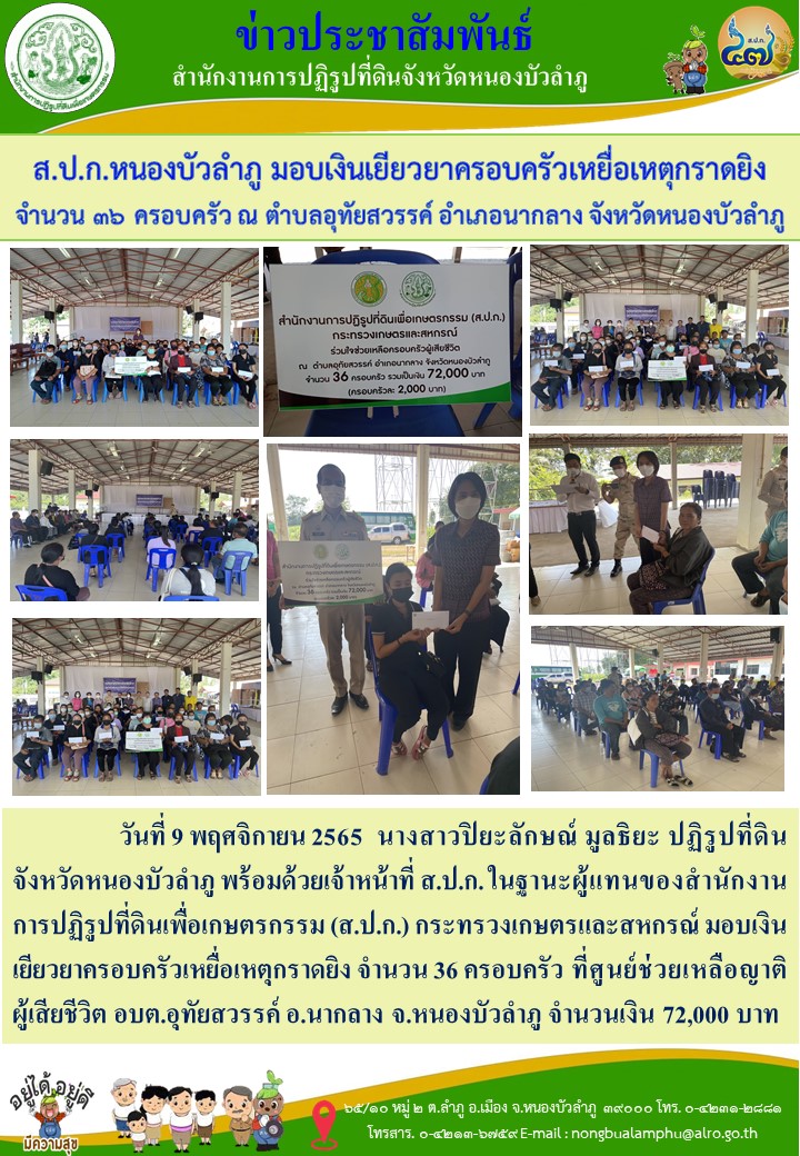 ส.ป.ก.หนองบัวลำภู มอบเงินเยียวยาครอบครัวเหยื่อกราดยิง จำนวน 36 ครอบครัว ณ ตำบลอุทัยสวรรค์ อำเภอนากลาง จังหวัดหนองบัวลำภู