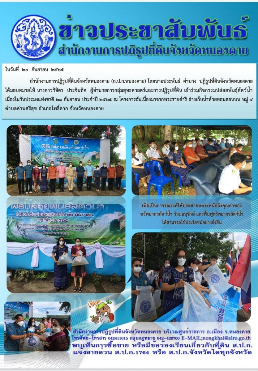 วันที่ 20 กันยายน 2565 นายประพันธ์ คำบาง ปฏิรูปที่ดินจังหวัดหนองคาย มอบหมายให้ นางสาววิจิตร ประจิมทิศ ผู้อำนวยการกลุ่มยุทธศาสตร์และการปฏิรูปที่ดิน เข้าร่วมกิจกรรมปล่อยพันธุ์สัตว์น้ำ