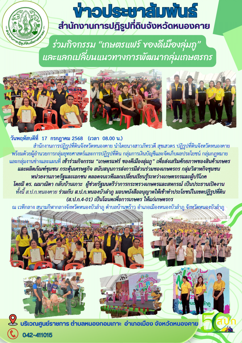 ปฏิรูปที่ดินจังหวัดหนองคาย พร้อมเจ้าหน้าที่ ร่วมกิจกรรม "เกษตรแฟร์ ของดีเมืองลุ่มภู" และร่วมกิจกรรมมอบโฉนดเพื่อการเกษตร พร้อมแลกเปลี่ยนแนวทางการพัฒนากลุ่มเกษตรกร